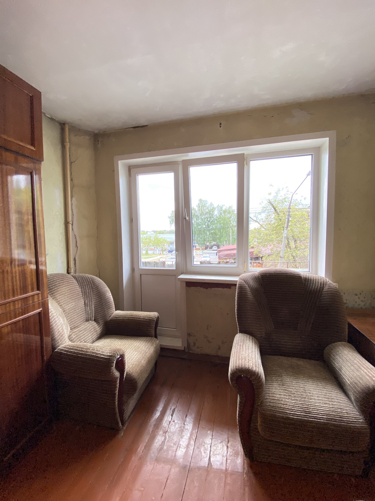 Окна ПВХ, в большой комнате с торца окна нет, закрыто.