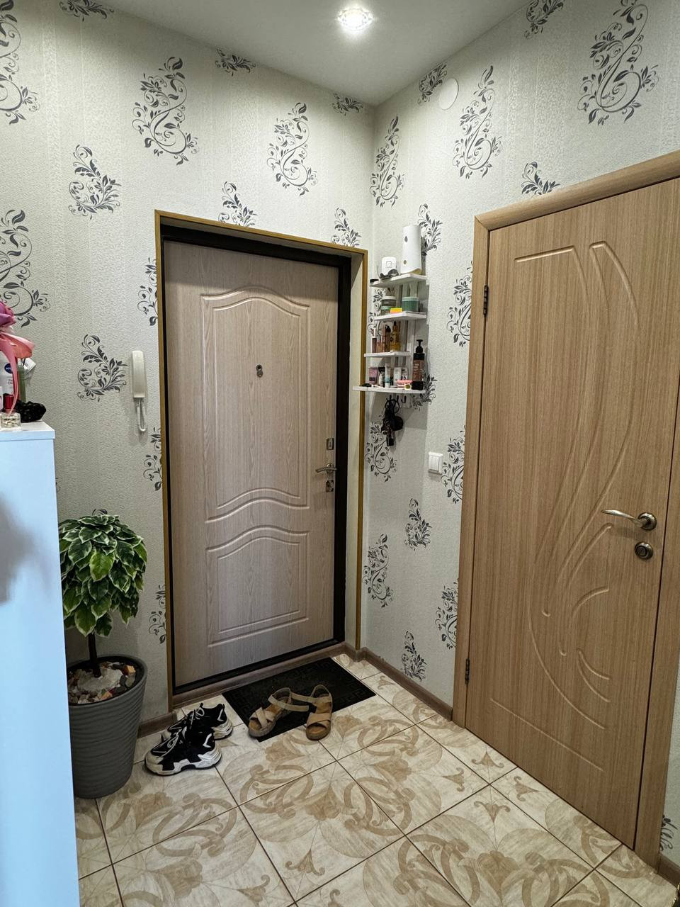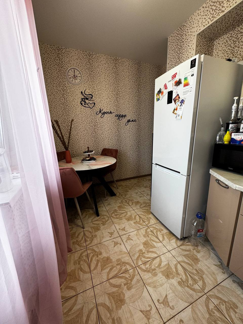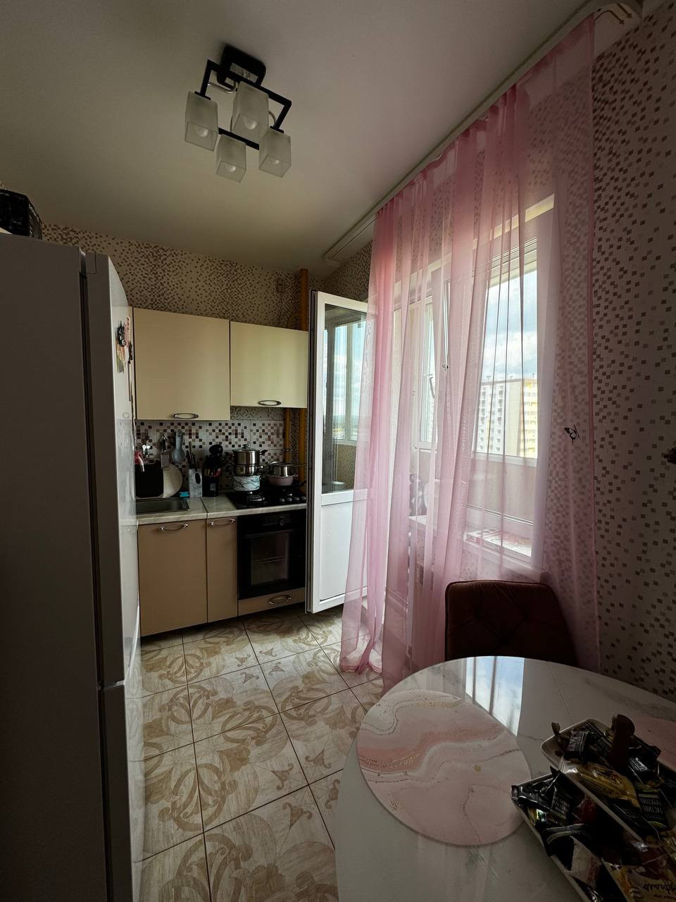 Квартира в отличном состоянии, выполнен хороший ремонт из качественных материалов, теплые полы, натяжные потолки, окна ПВХ, домофон, проведен интернет кабель, счетчики на воду, газ, остается кухонный гарнитур.