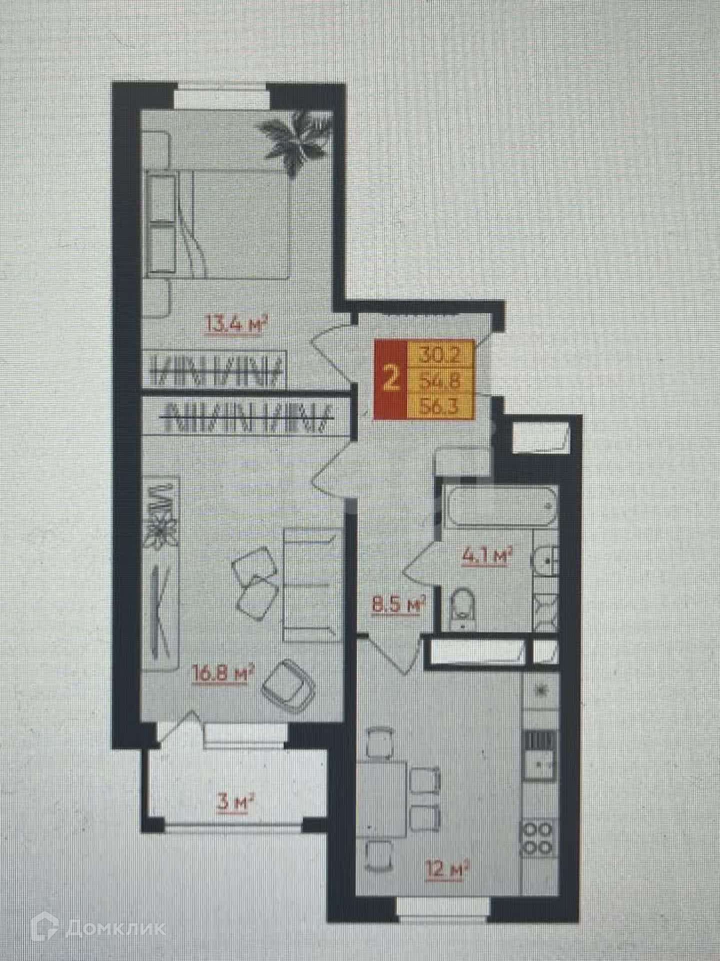 2-комнатная квартира, 54.6 м2, этаж 7 / 16, на продажу в Твери