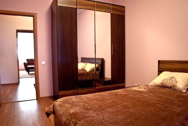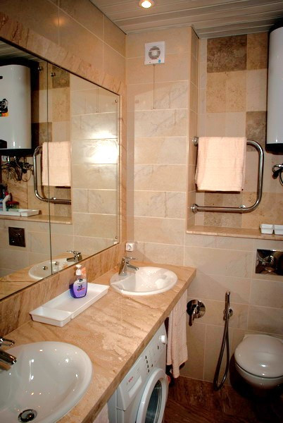 В квартире выполнен косметический ремонт, благодаря чему она выглядит свежо и аккуратно. Санузел совмещённый, что является удобным решением для экономии пространства, стены и пол облицованы итальянским мрамором, а два умывальника расположены на единой мраморной столешнице. Имеется электробойлер для бесперебойного горячего водоснабжения, стиральная машина, встроенный унитаз дополнен лейкой - биде.