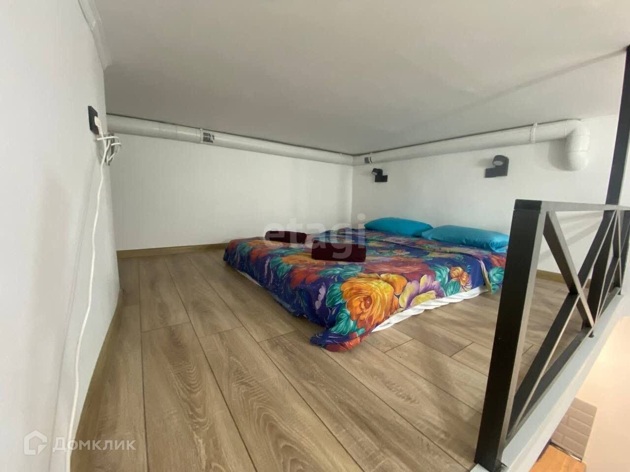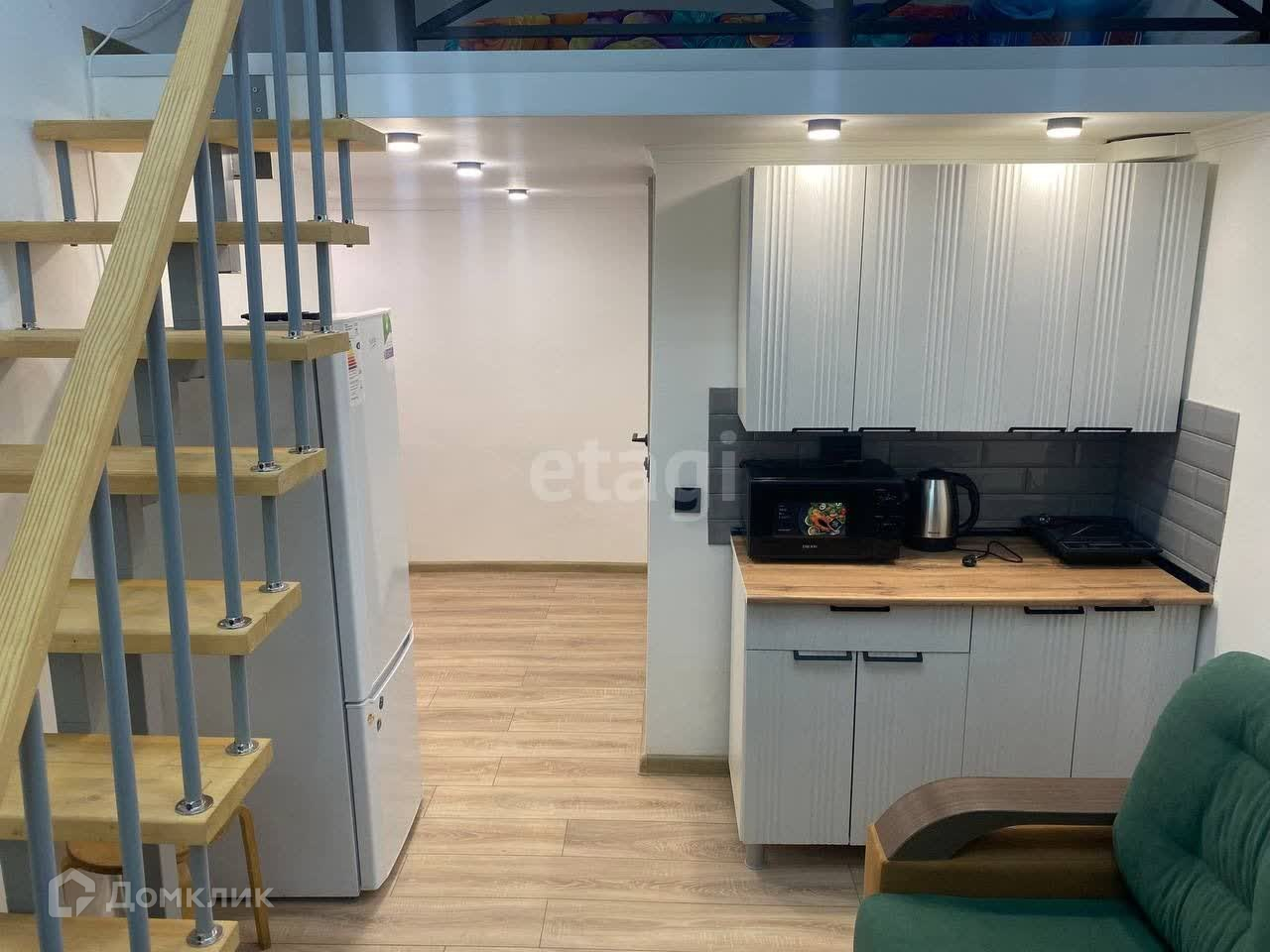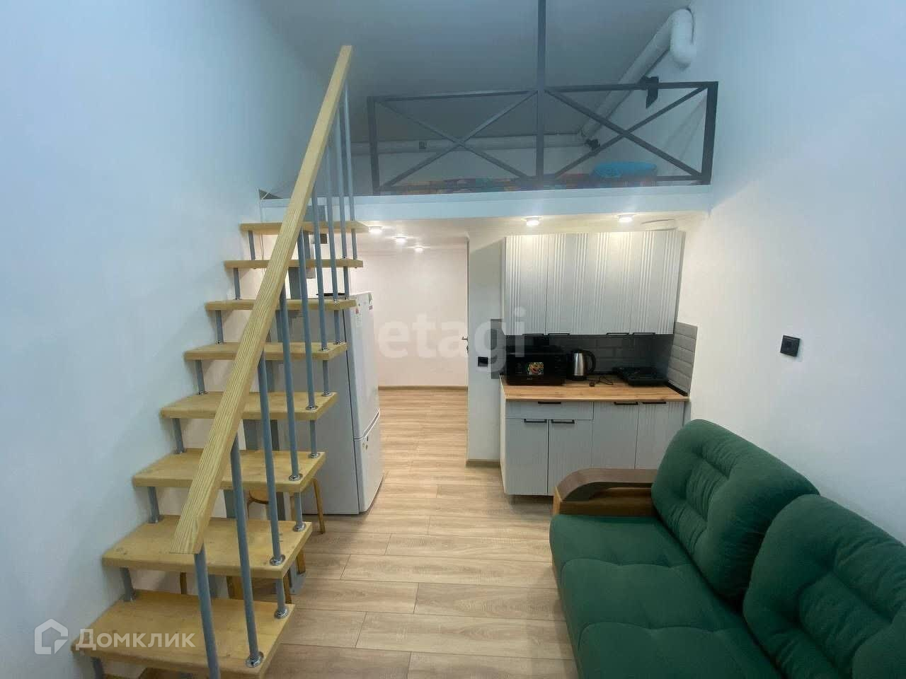 Общая площадь 23 м2, верхний уровень - спальное место. За счет высоких потолков (3,6 м) складывается ощущение просторного помещения.