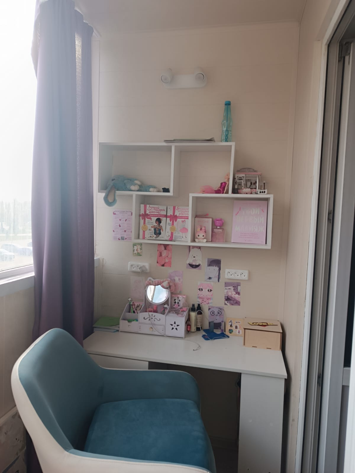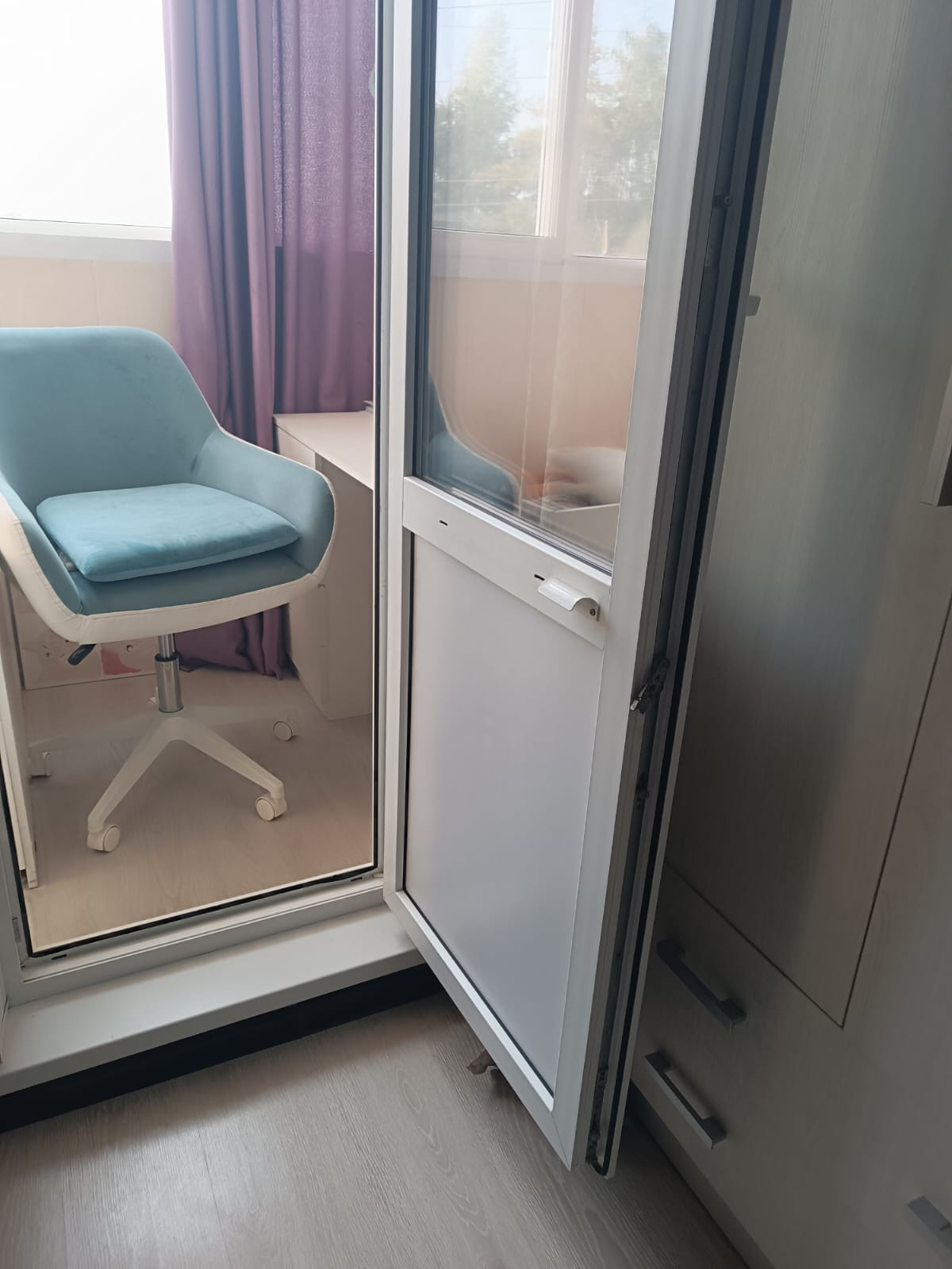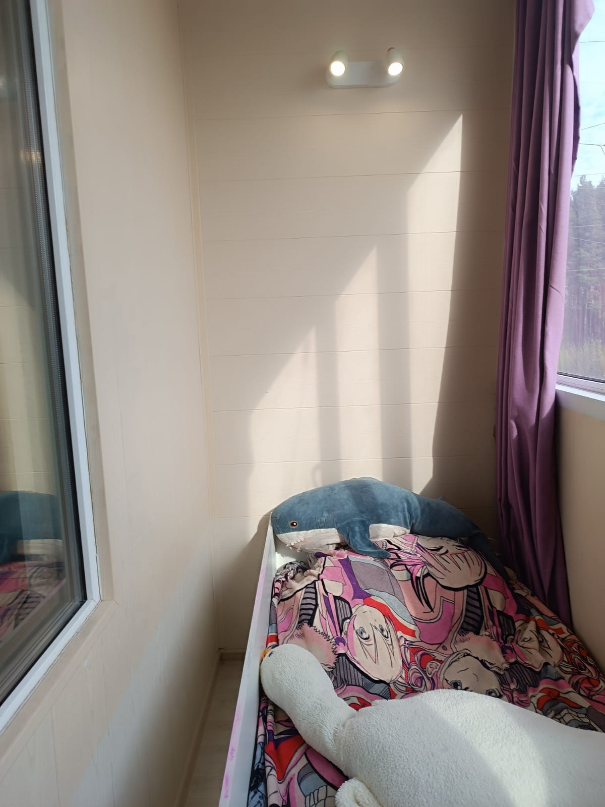 Тройные стеклопакеты, балкон полностью обустроен , утеплен, проведены теплые полы, свет, используется как детская.