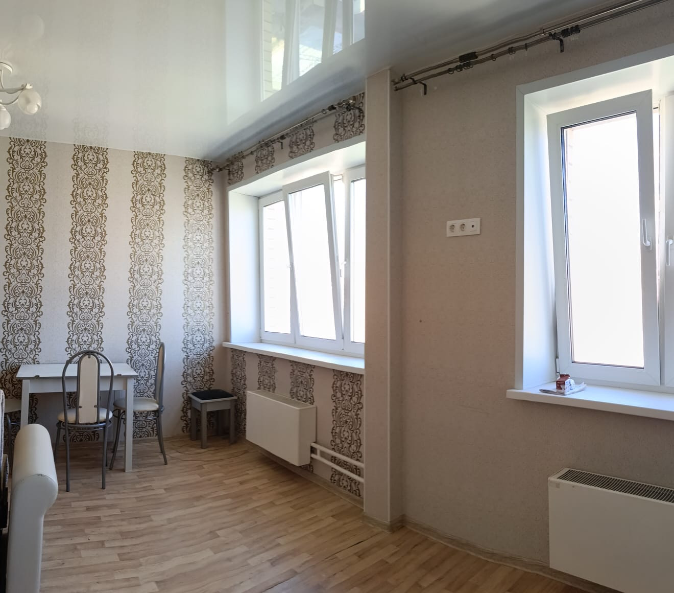 -Большая, светлая кухня-гостиная с двумя окнами. Разделена на зону отдыха и столовой.