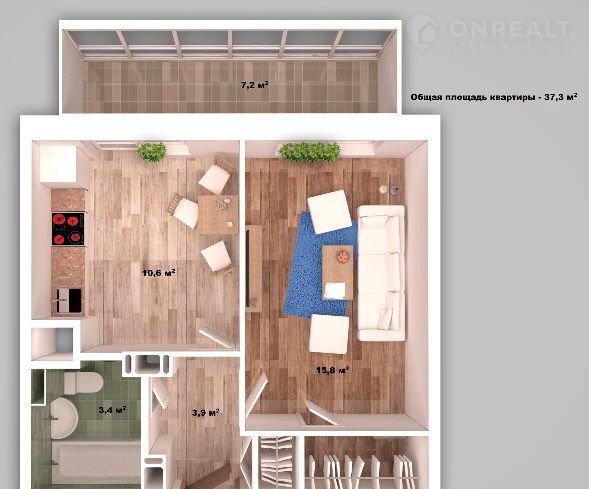 Общая площадь 37.3 м2