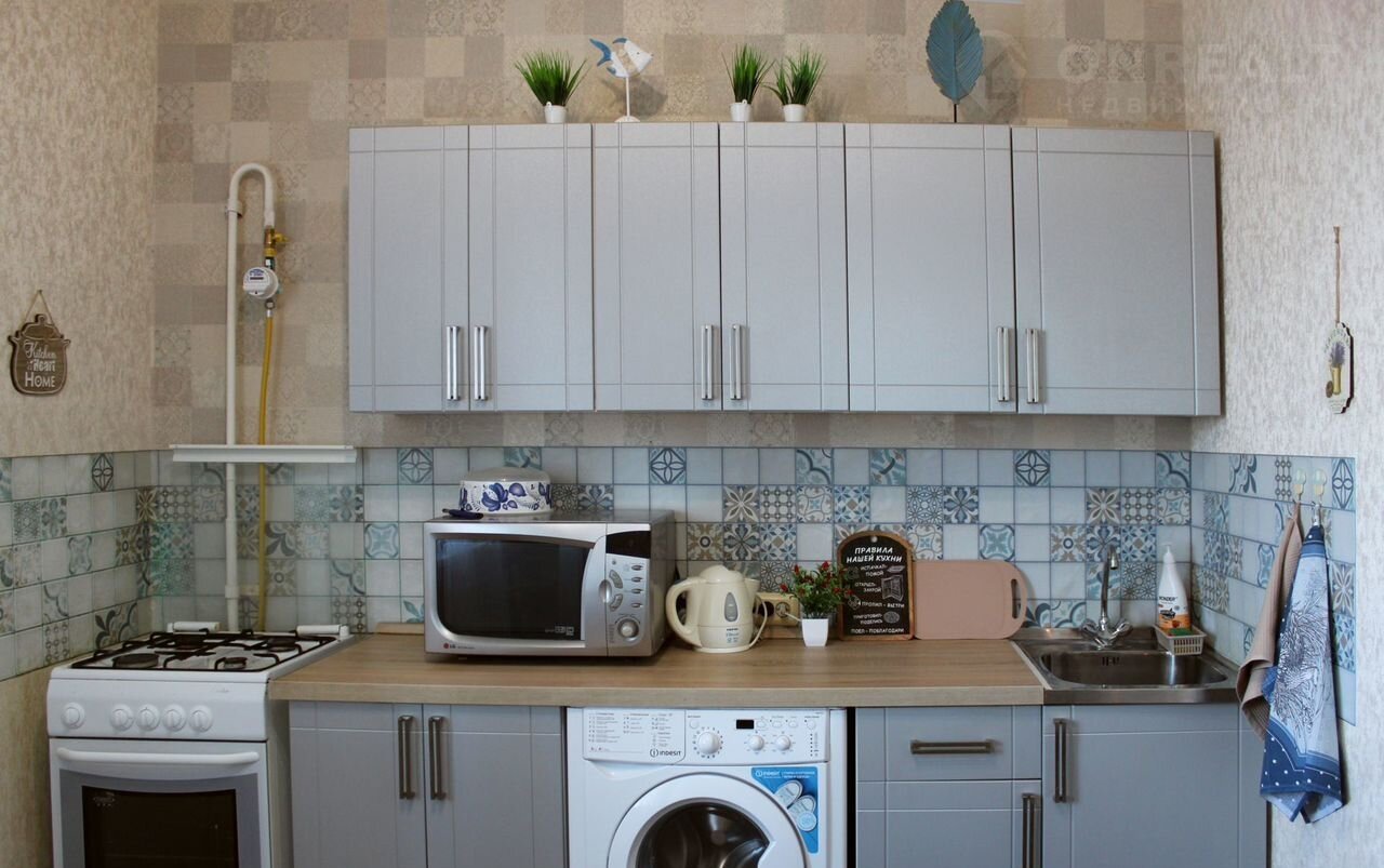 — кухня со всей техникой (плита, микроволновка, чайник, стиральная машина);