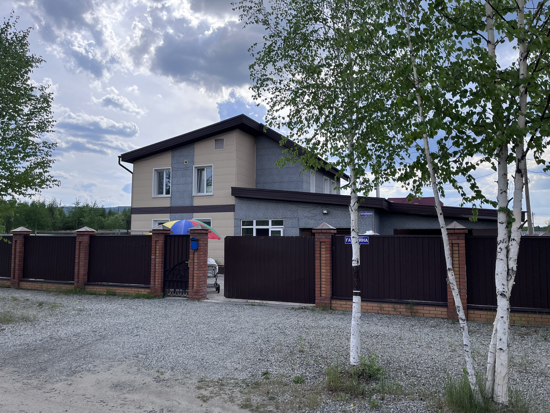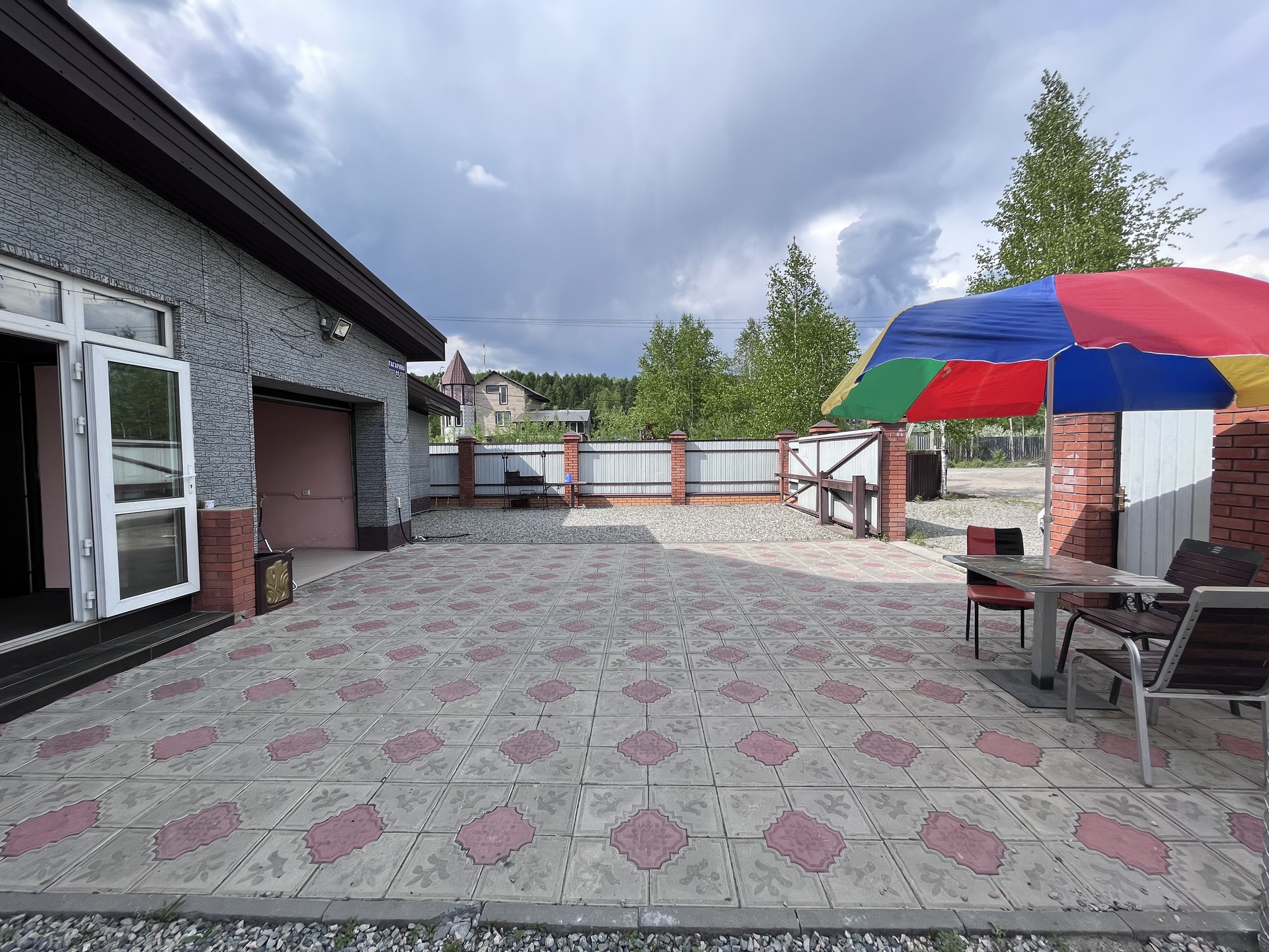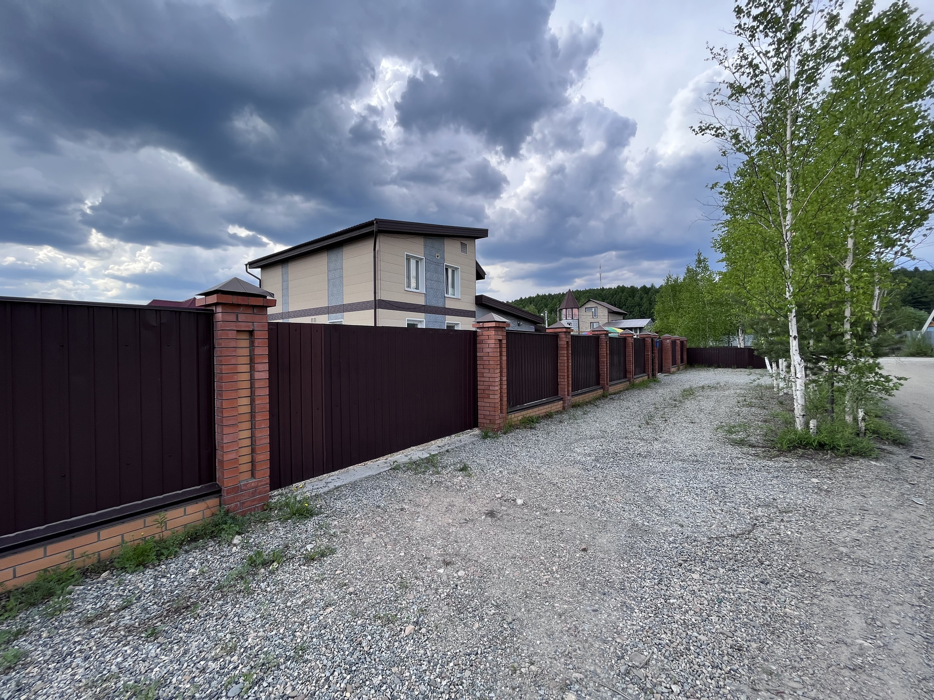 Территория огорожена цельно металлическим забором, 2 въезда на территорию, перед домом уложена тротуарная плитка, 1 вольер для собаки.