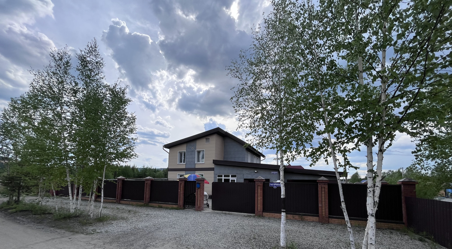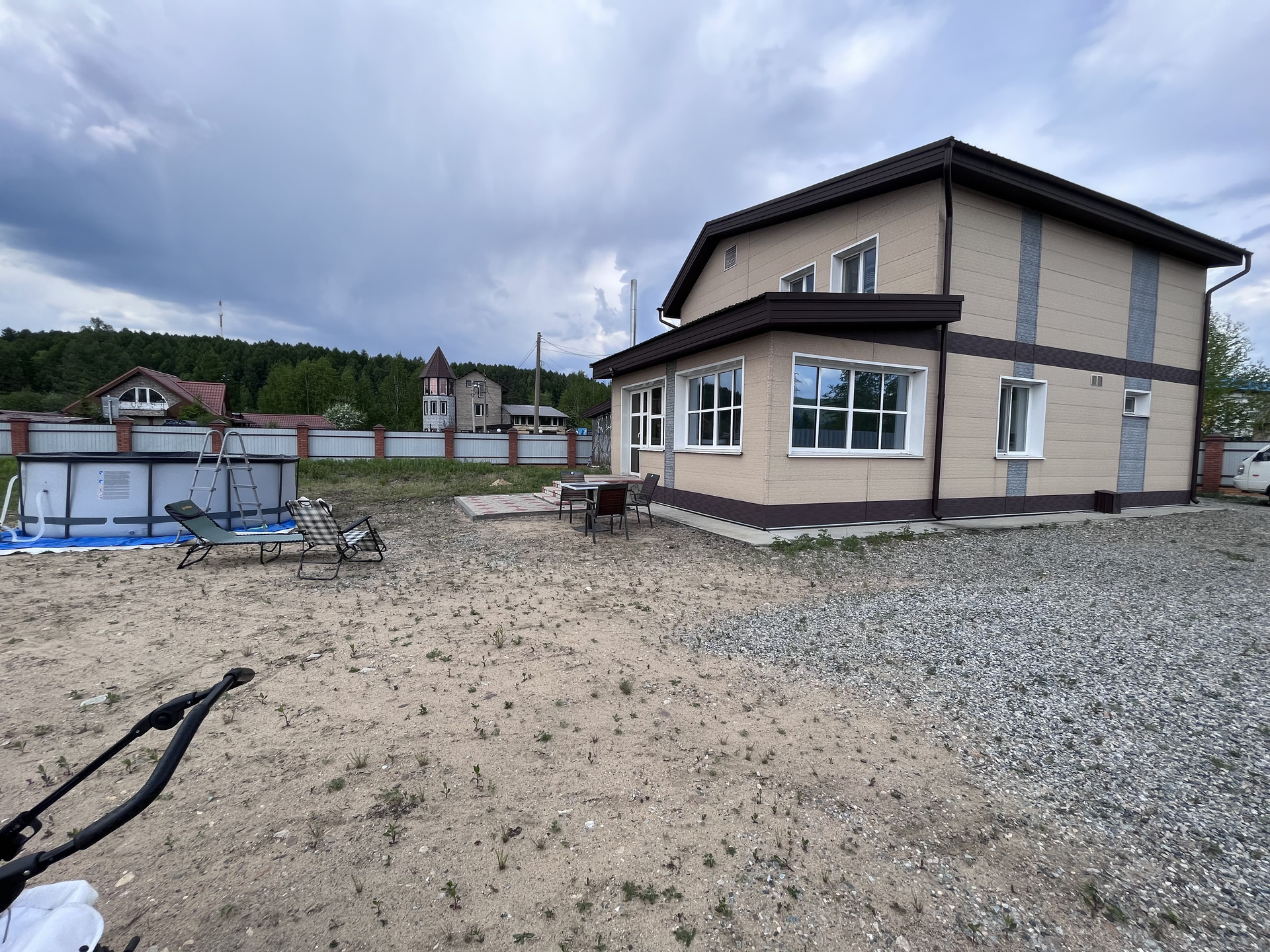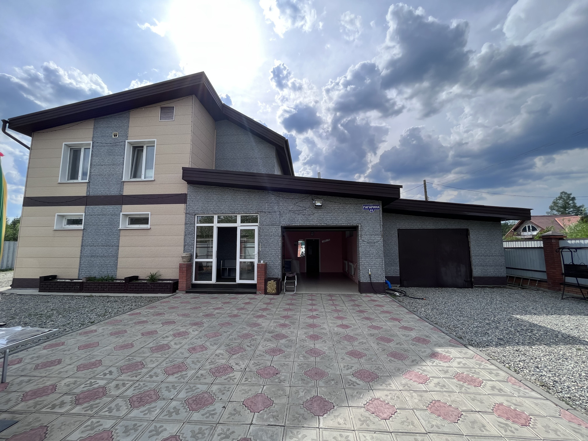 Территория огорожена цельно металлическим забором, 2 въезда на территорию, перед домом уложена тротуарная плитка, 1 вольер для собаки.