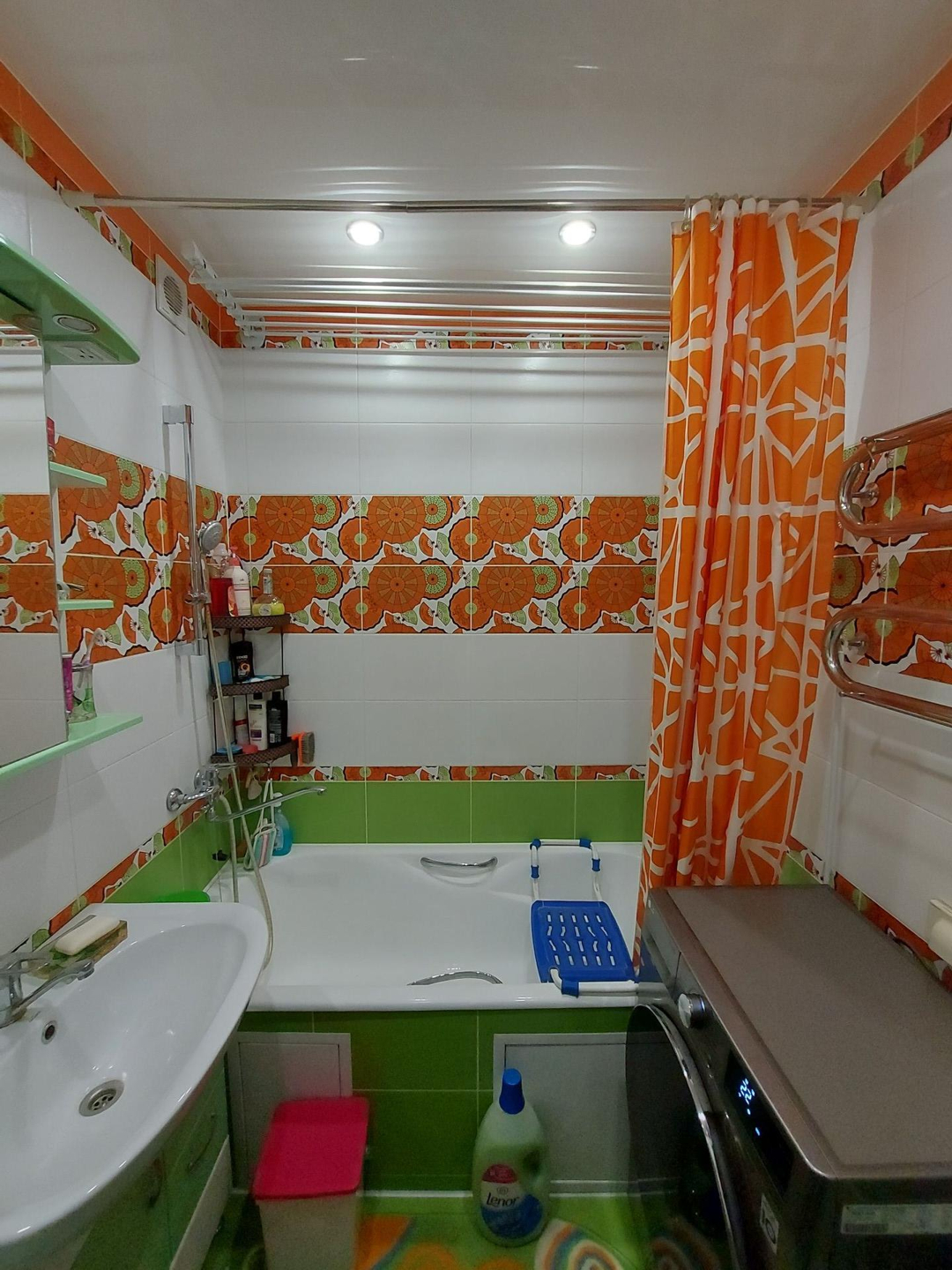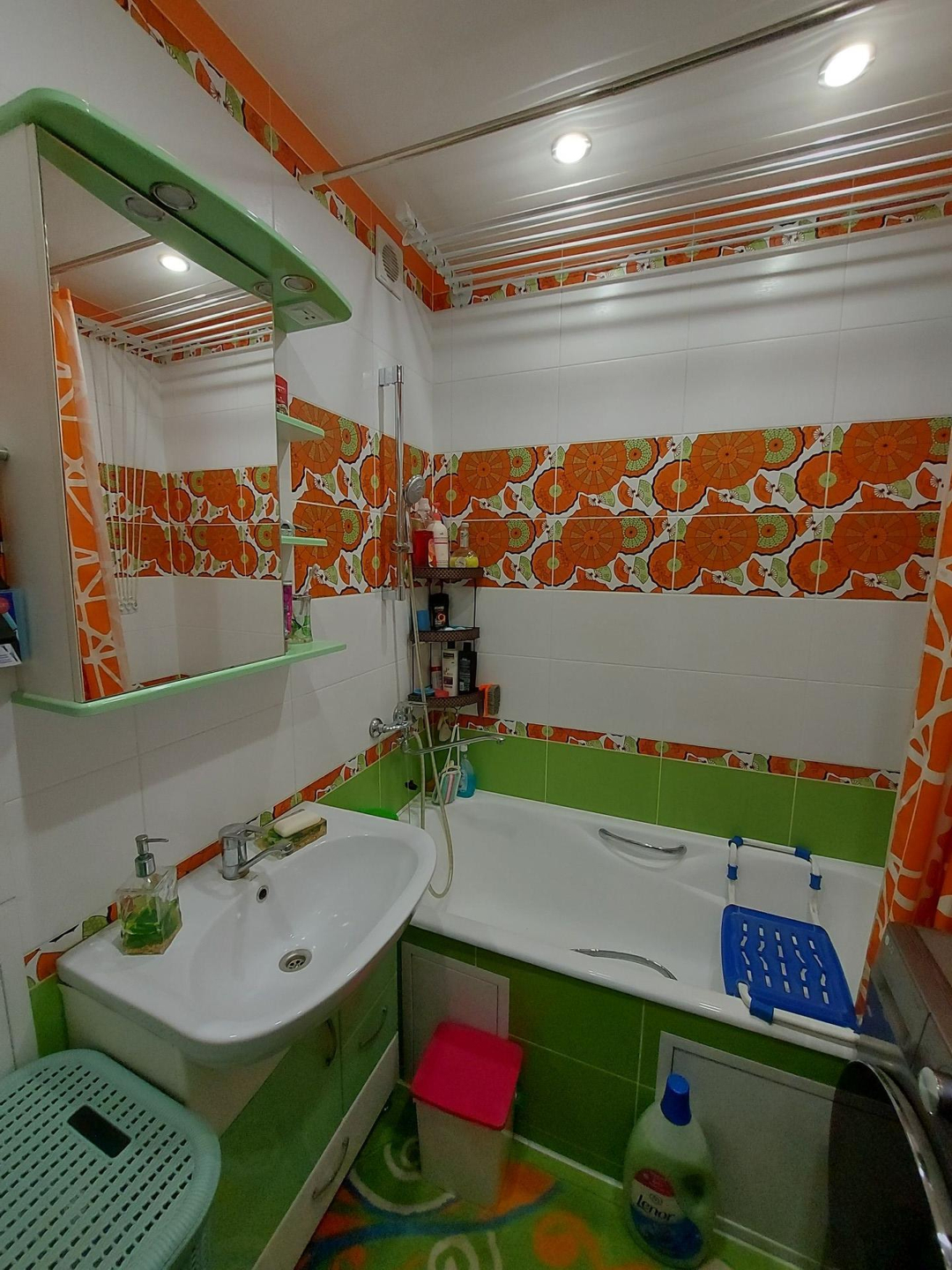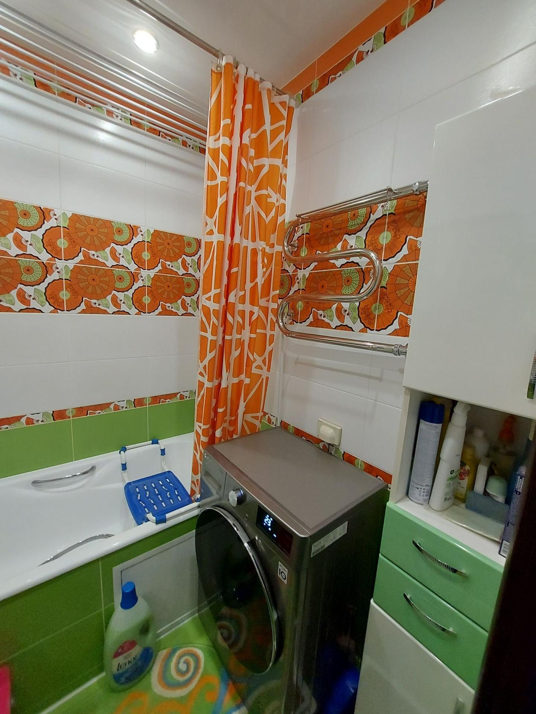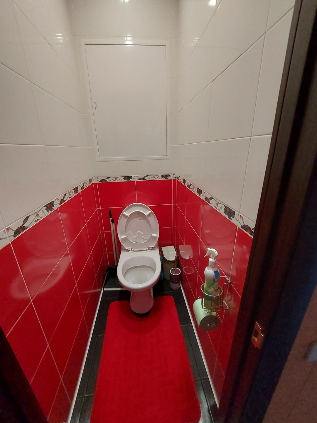 Ванная и туалет выложены кафелем,  натяжные  потолки,  пол в ванной с подогревом.  В ванной остаётся мебель.  Установлен бойлер на 80 л.