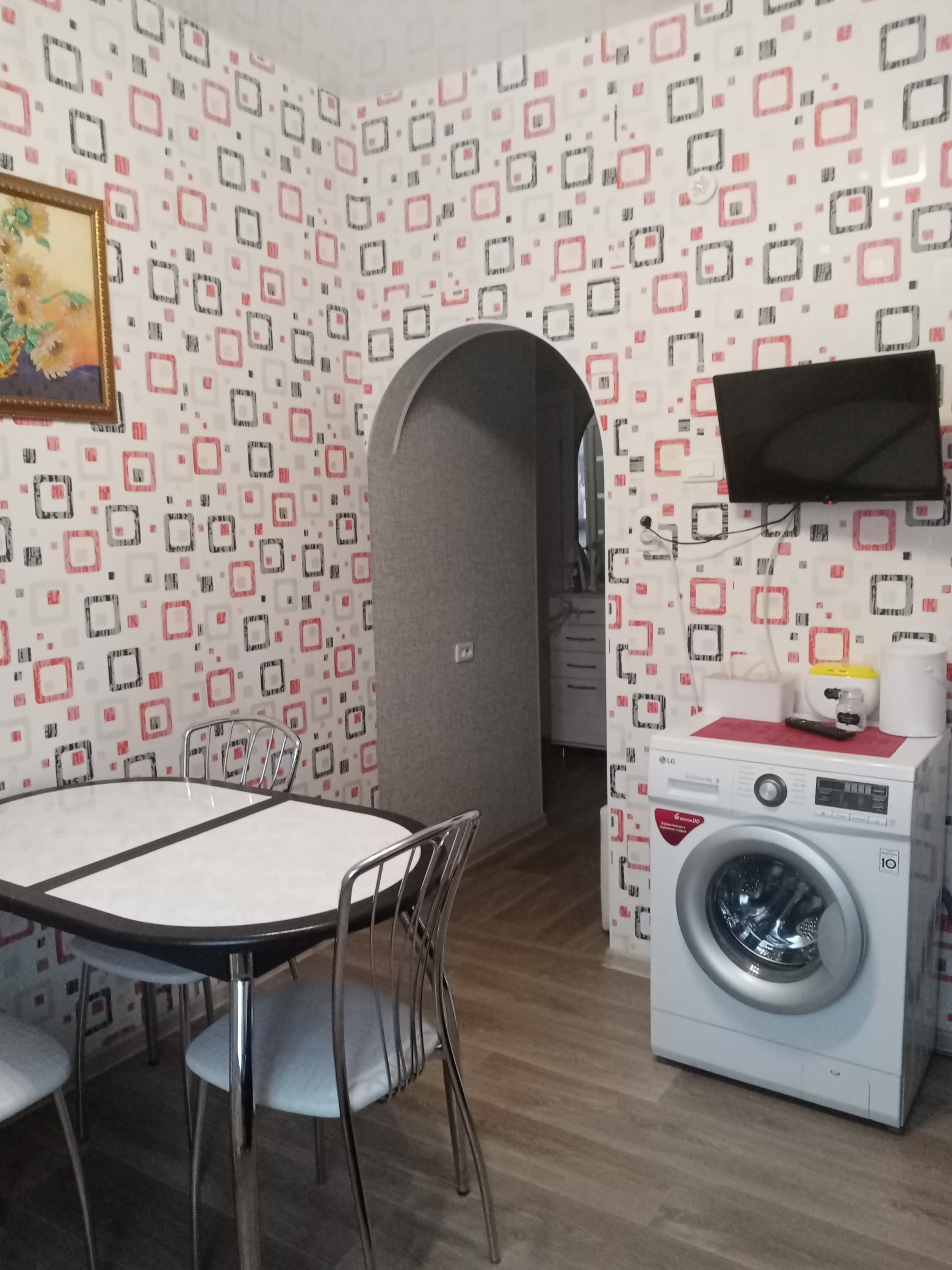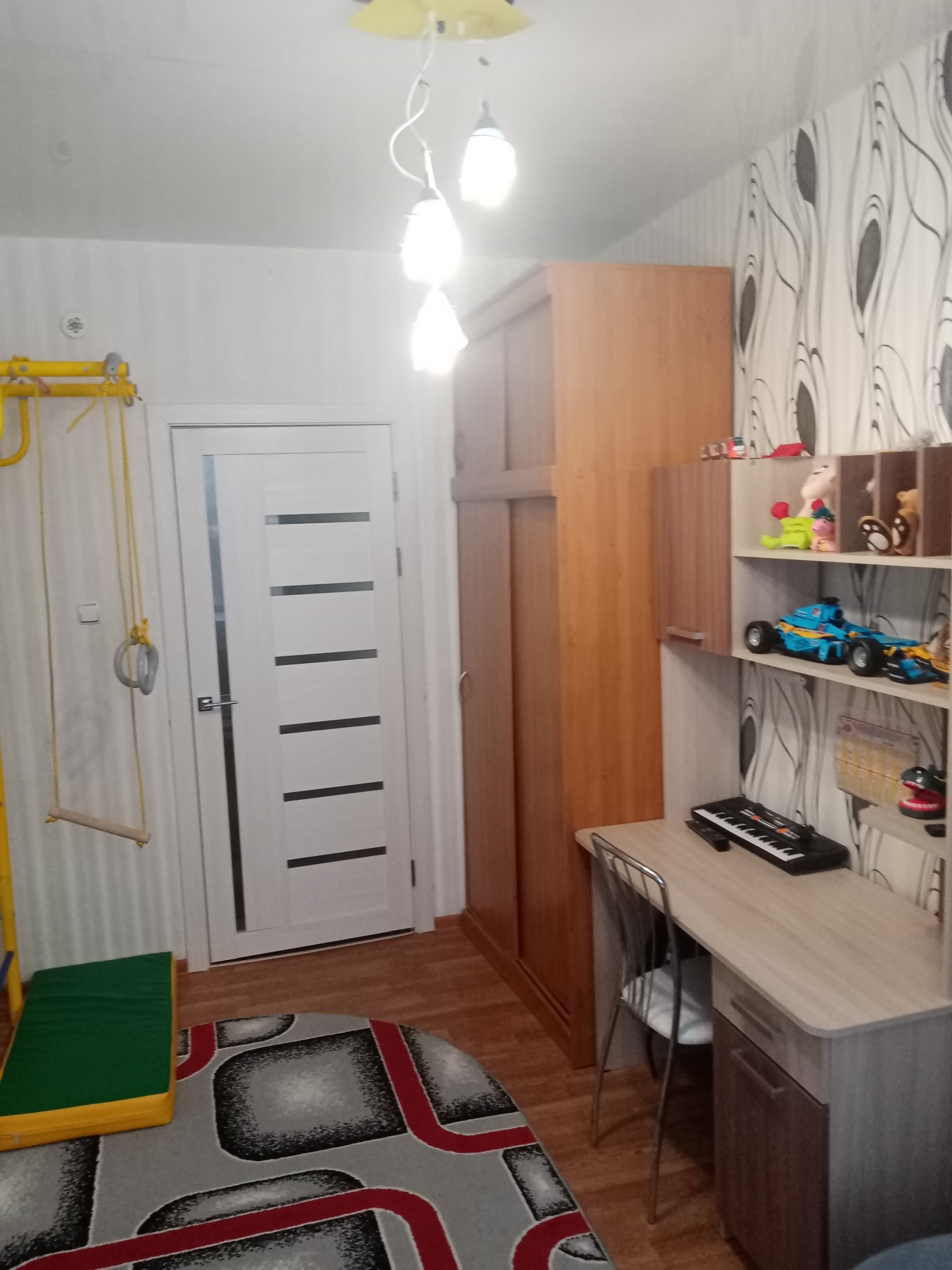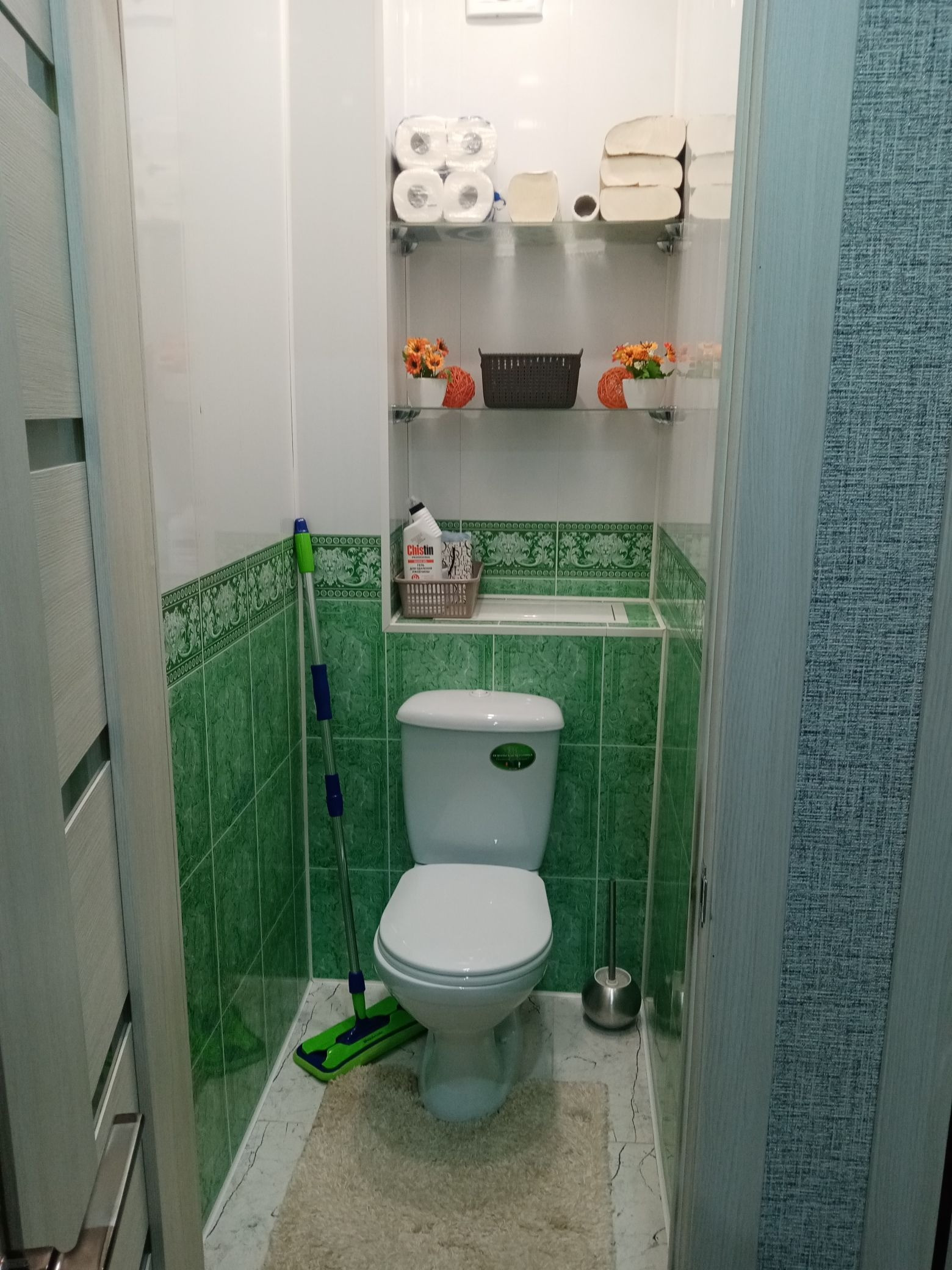 Натяжные потолки.Ванна и туалет отделка: плитка -пол, снены и потолок-панели.Частично остается мебель и бытовая техника!