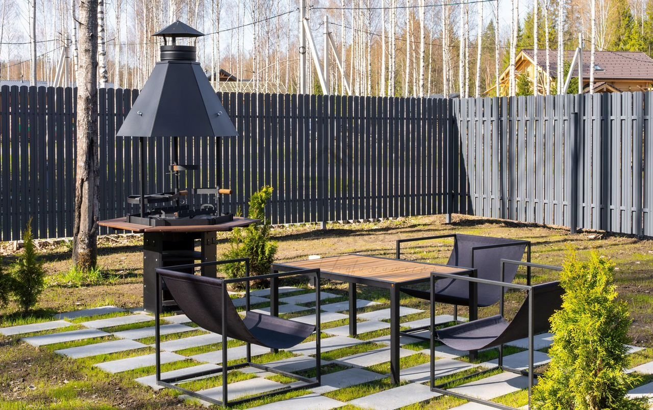 Просторная территория разделена на функциональные зоны отдыха, включая мангальную зону с грилем и мебелью, большой морозоустойчивый бассейн с подогревом и системой самоочистки.
