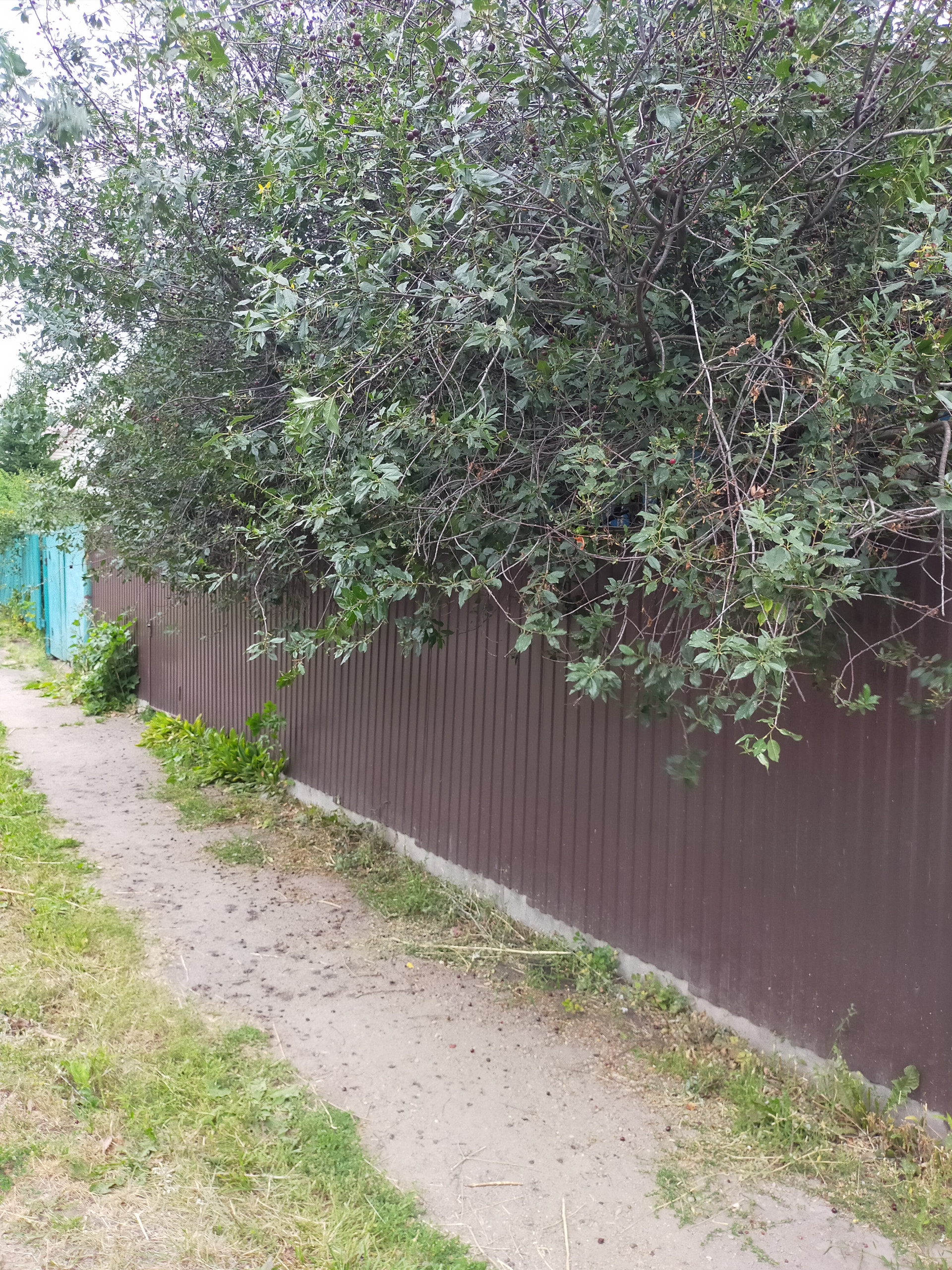 Забор из профнастила. Участок ровный,правильной формы. В саду растут яблони, вишни, цветы
