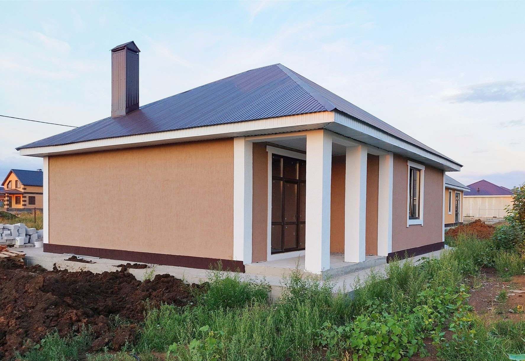 Дом построен из газобетона и облицован штукатуркой короед. Это гарантирует его долговечность и устойчивость к различным внешним воздействиям.