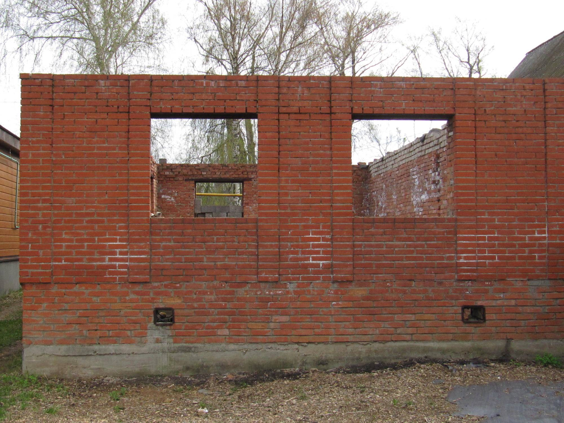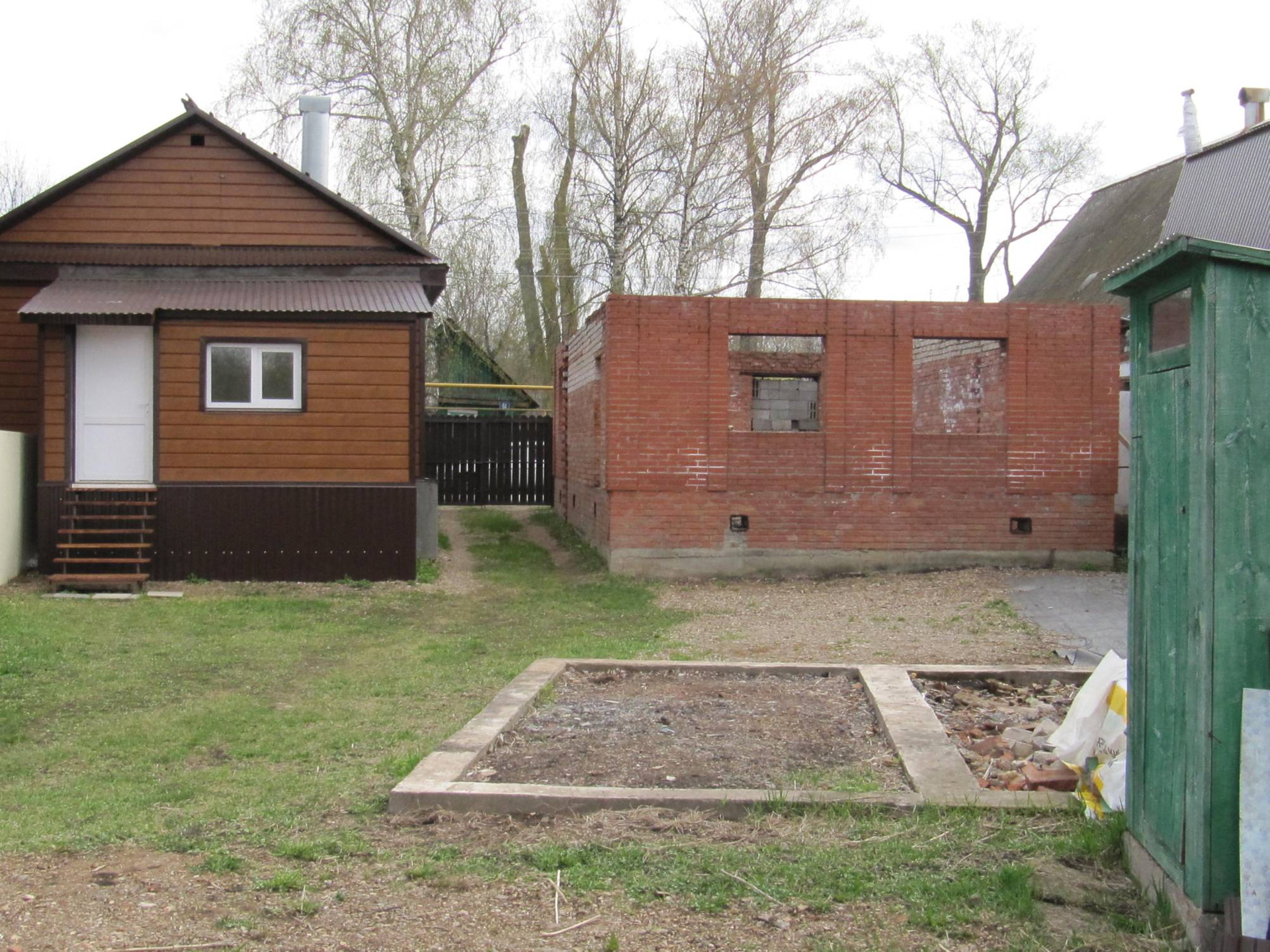 На территории построена коробка из кирпича будущего нового дома  ,фундамент для бани .