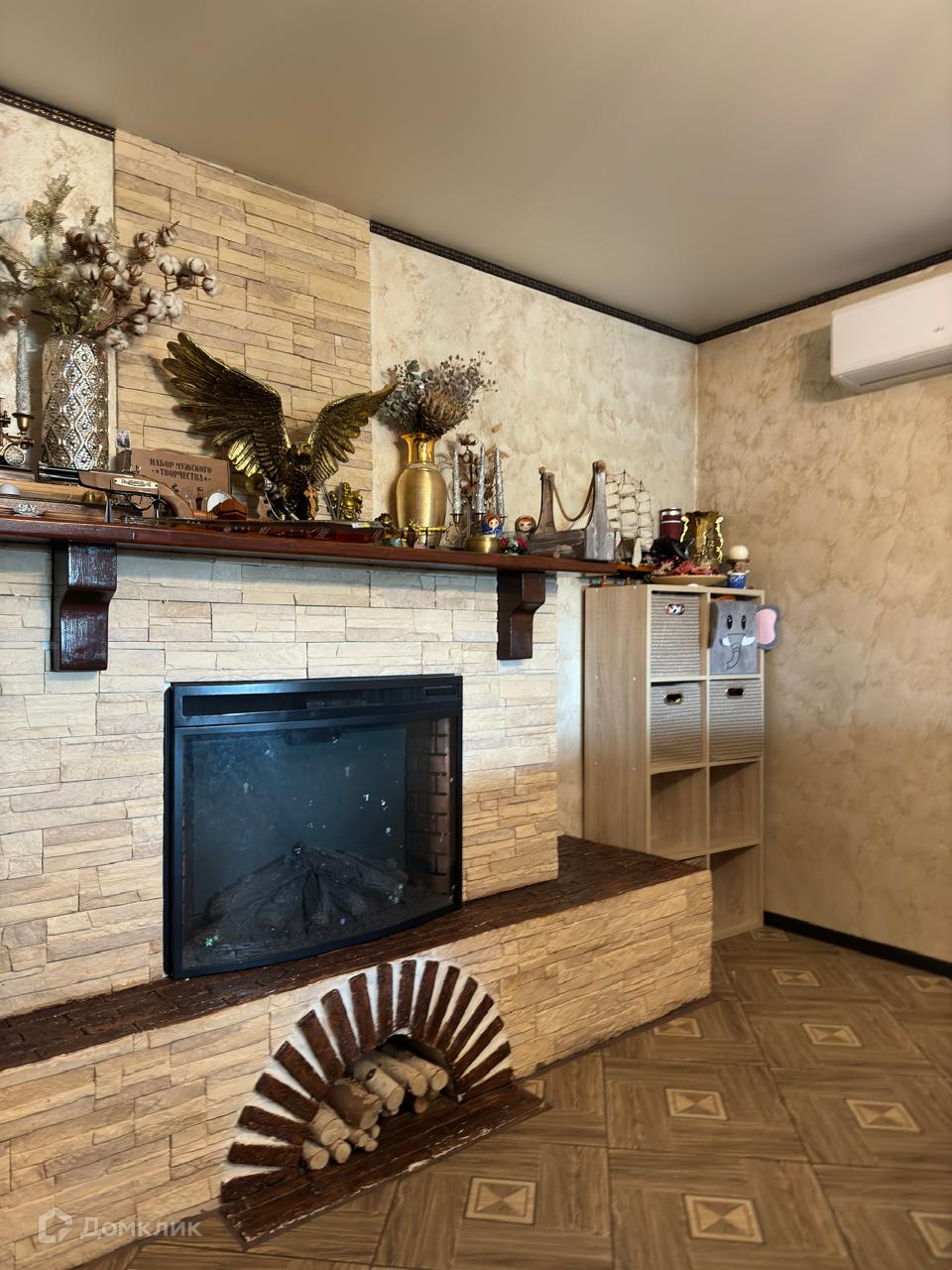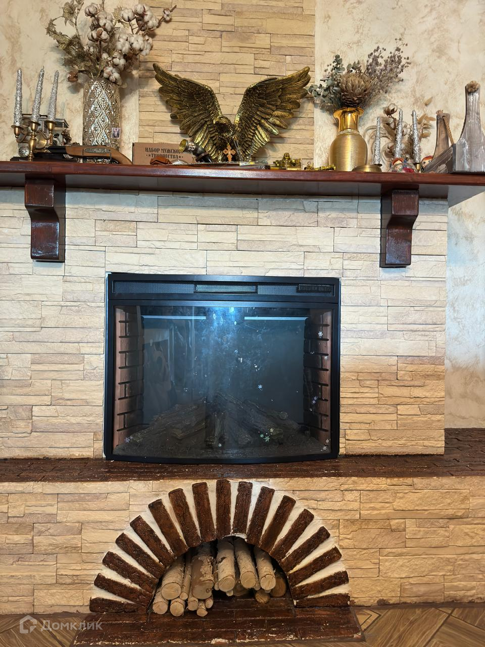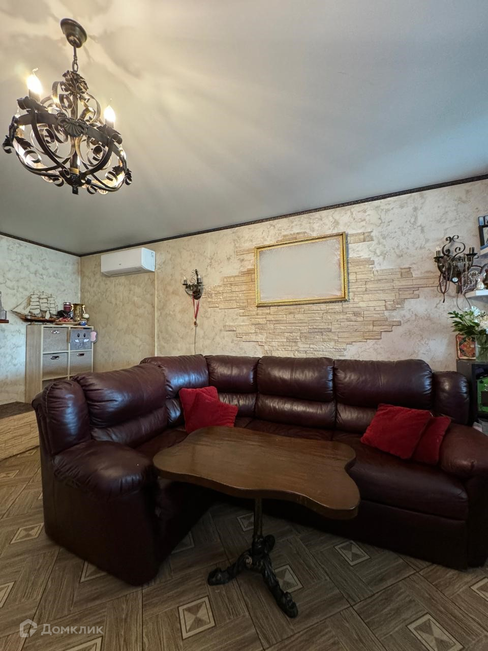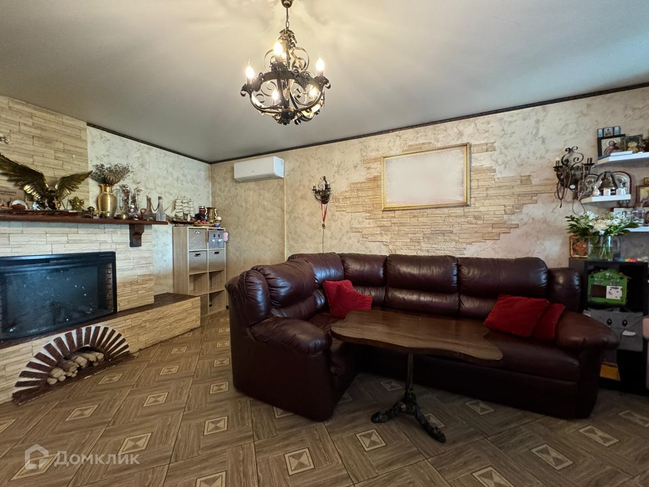 Камин в гостиной. Большой кожаный диван.