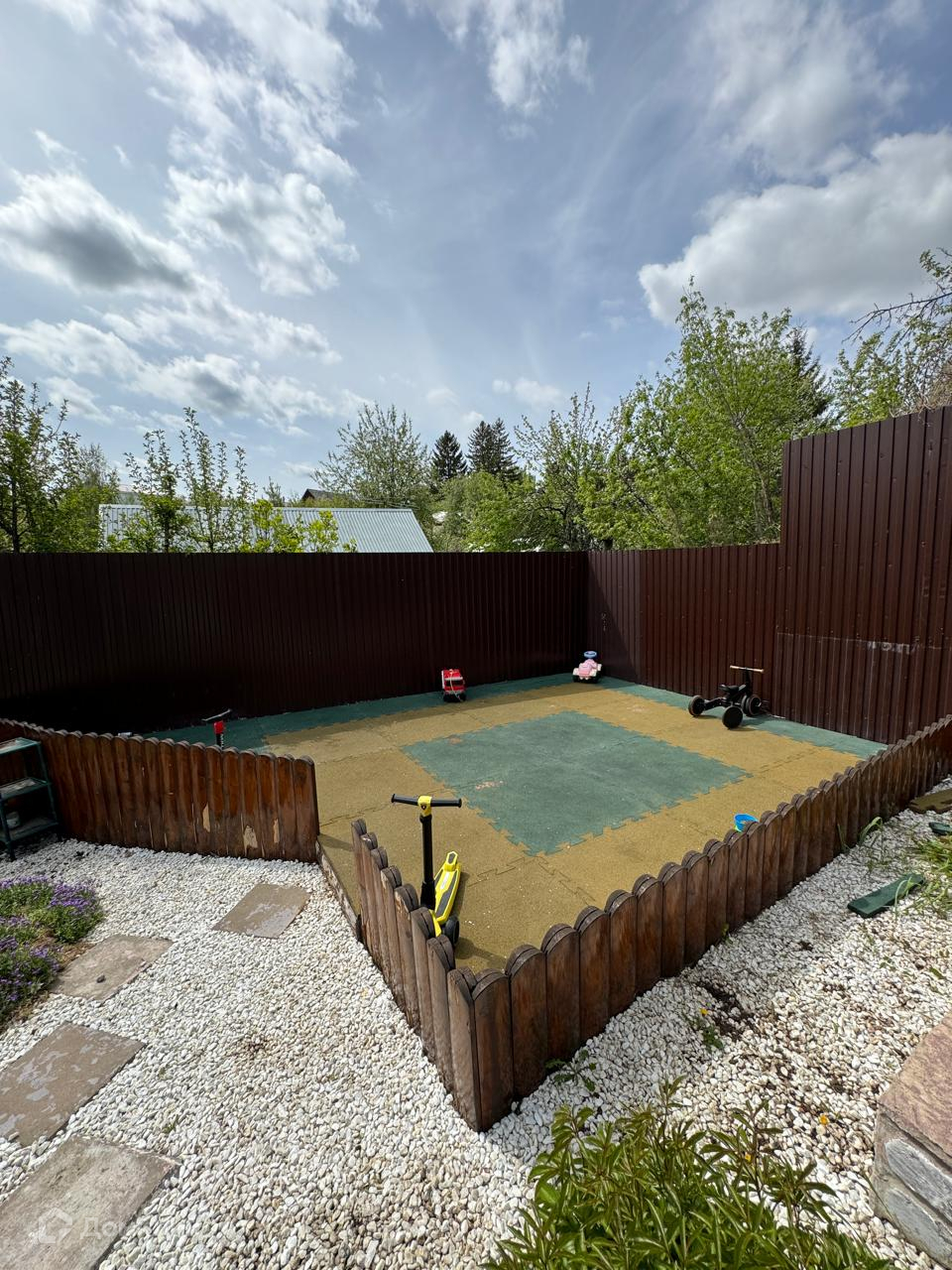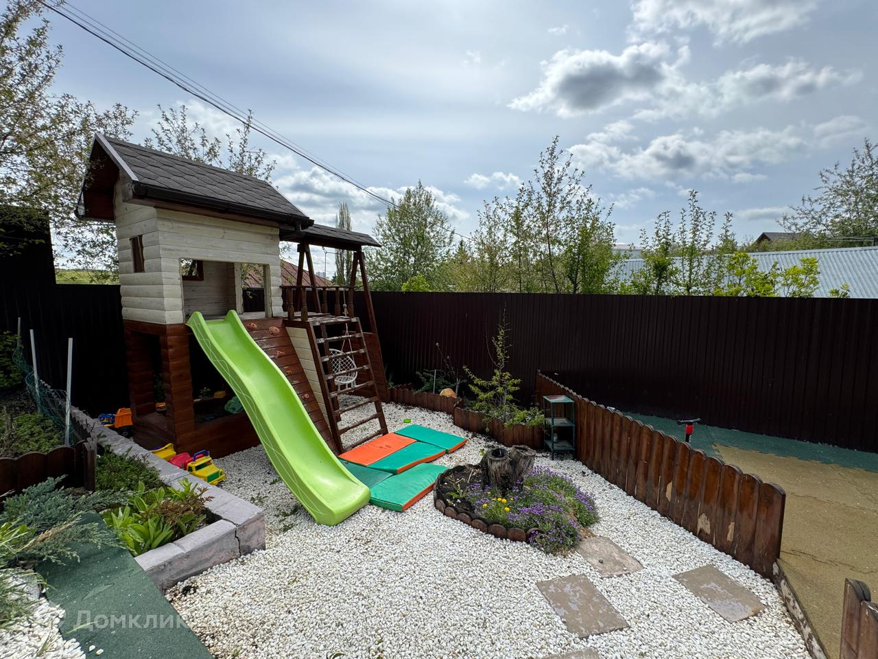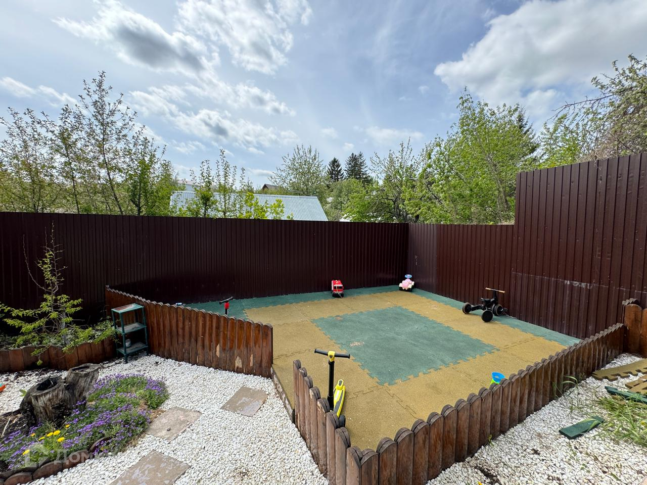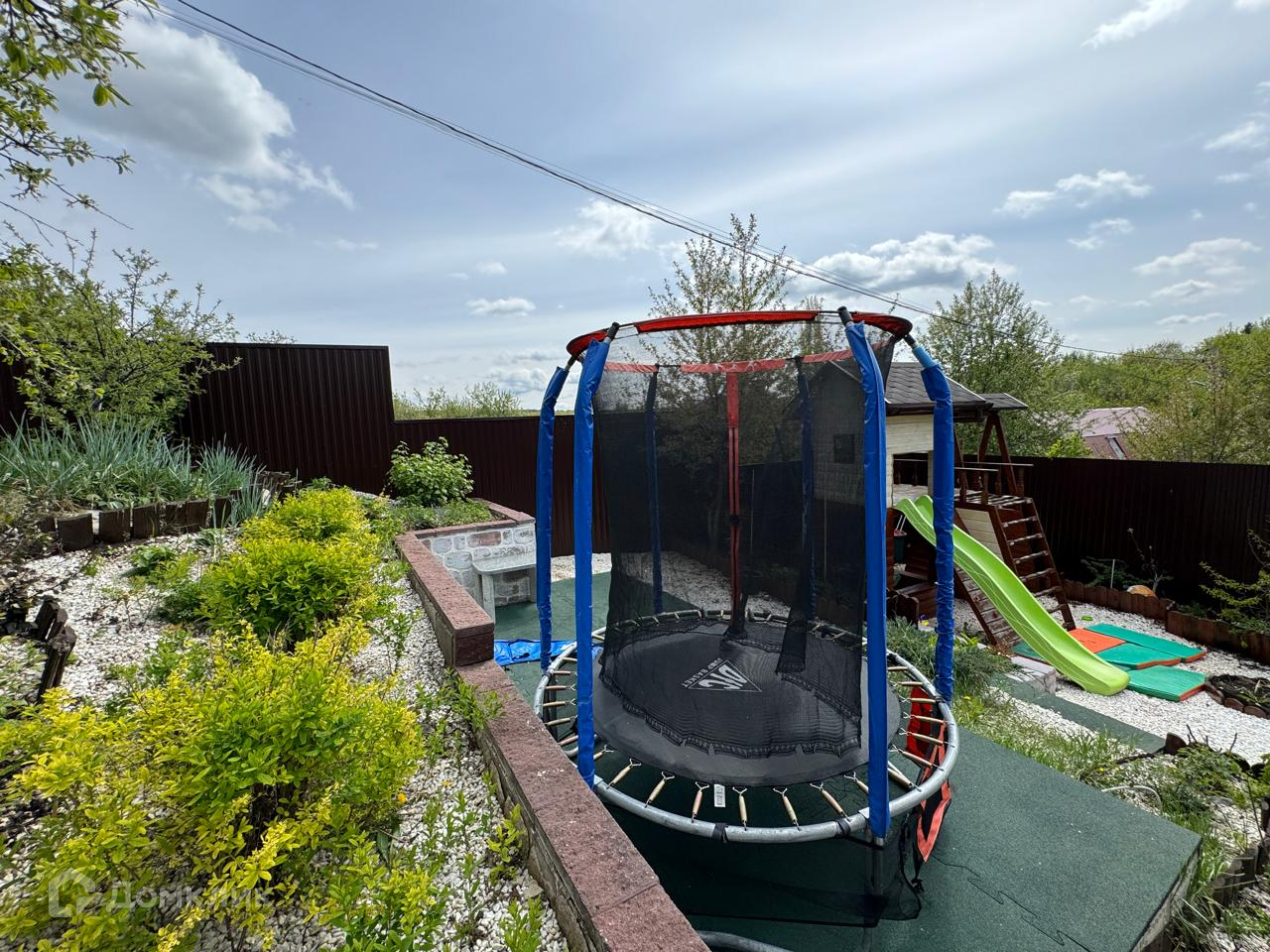 На участке крытая беседка и детская площадка.