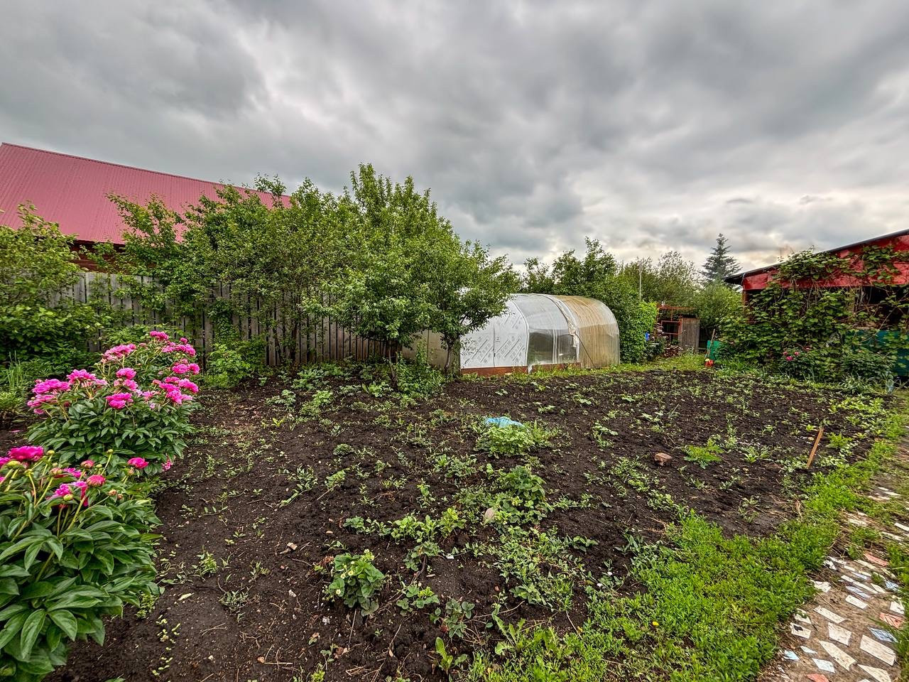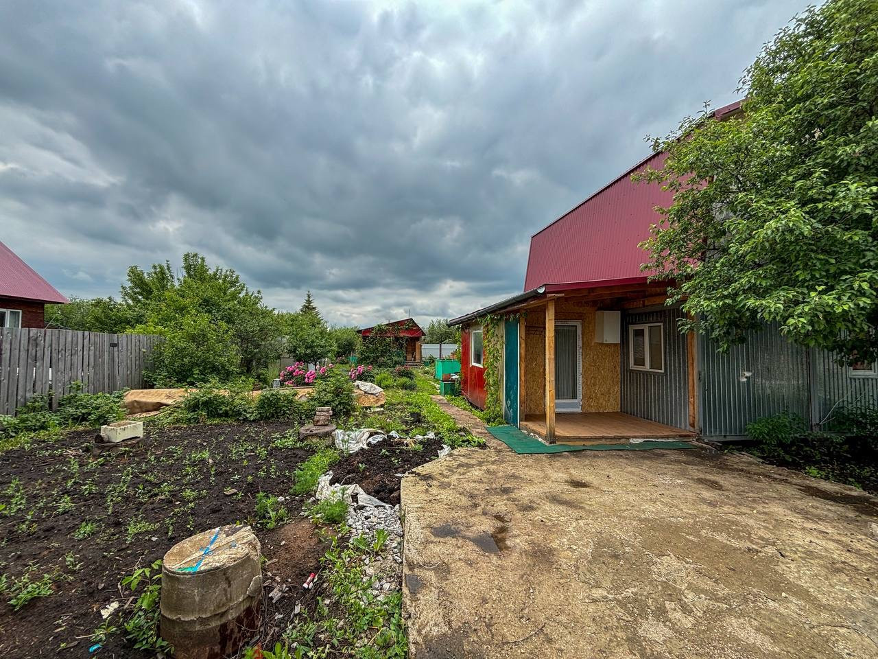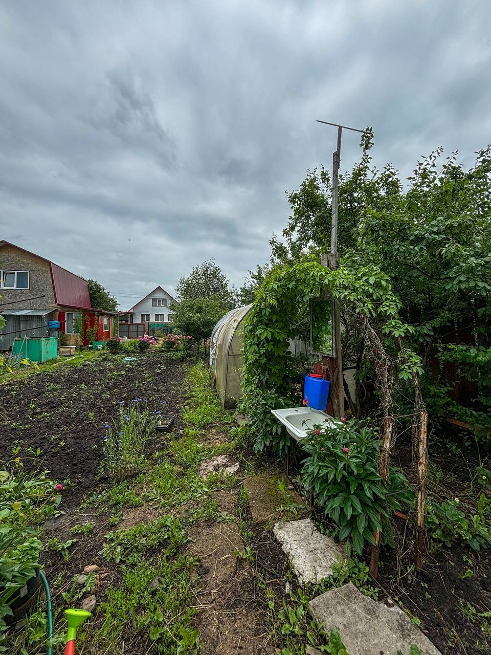 Также на участке расположены плодородные насаждения: ирга, смородина, слива, вишня, яблоня, виноград и малина, обеспечивая свежие фрукты и ягоды. Есть теплица для выращивания овощей, погреб для хранения урожая и солений круглый год.