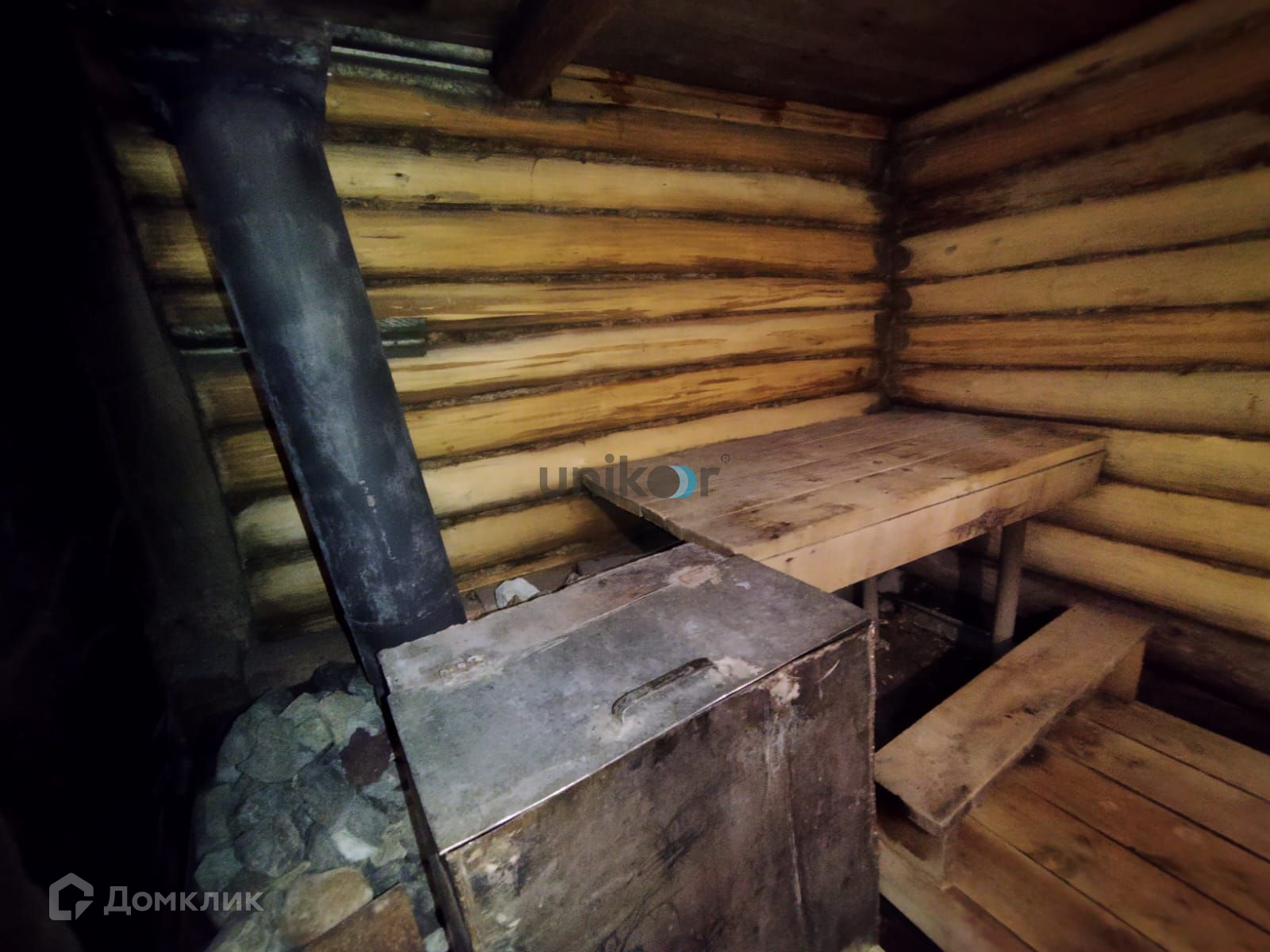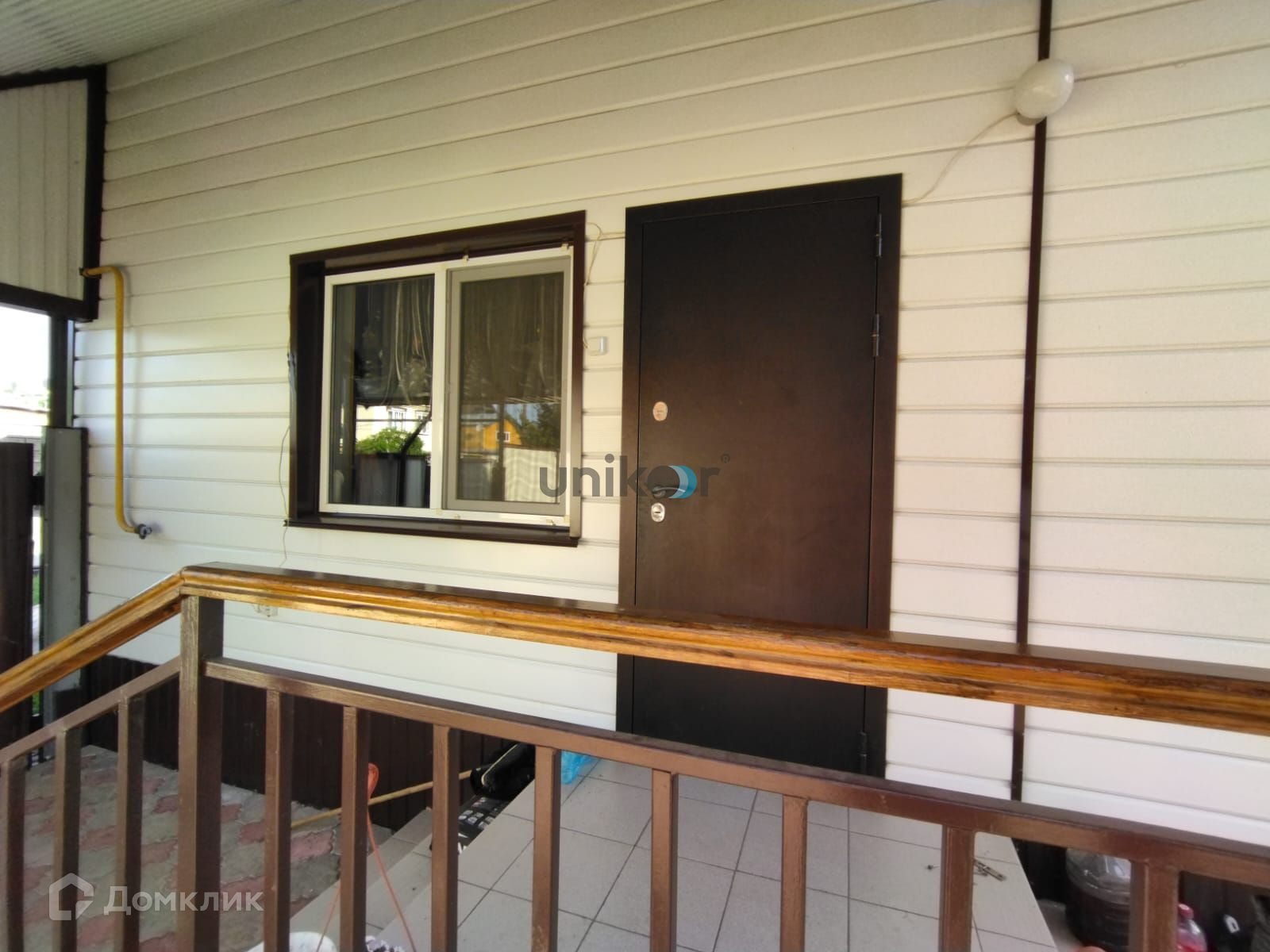 Стены: Бревна и керамзитобетонные блоки (пристрой), утеплитель, обшит металлическим сайдингом. В доме тепло зимой и прохладно летом.
