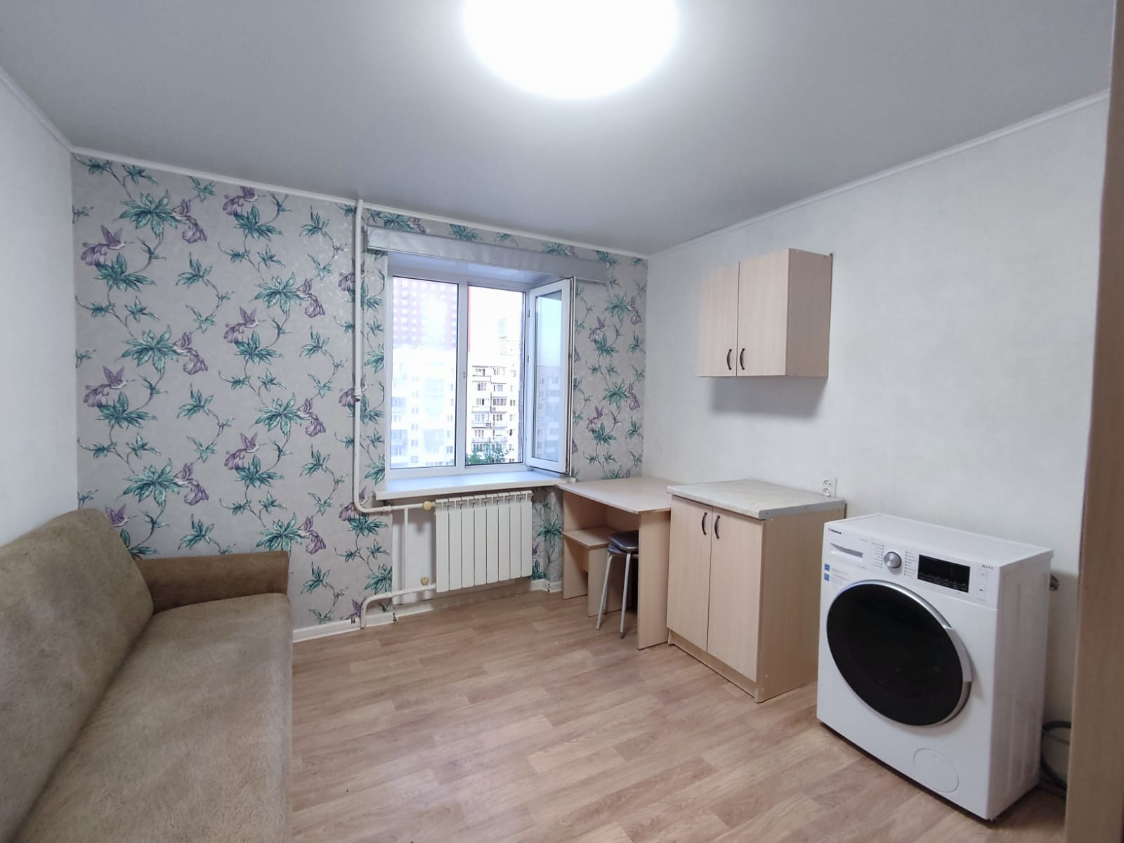 Остается всё, что вы видите на фото: кухонные шкафчики, стол, холодильник, шкаф, диван, стиральная машина.