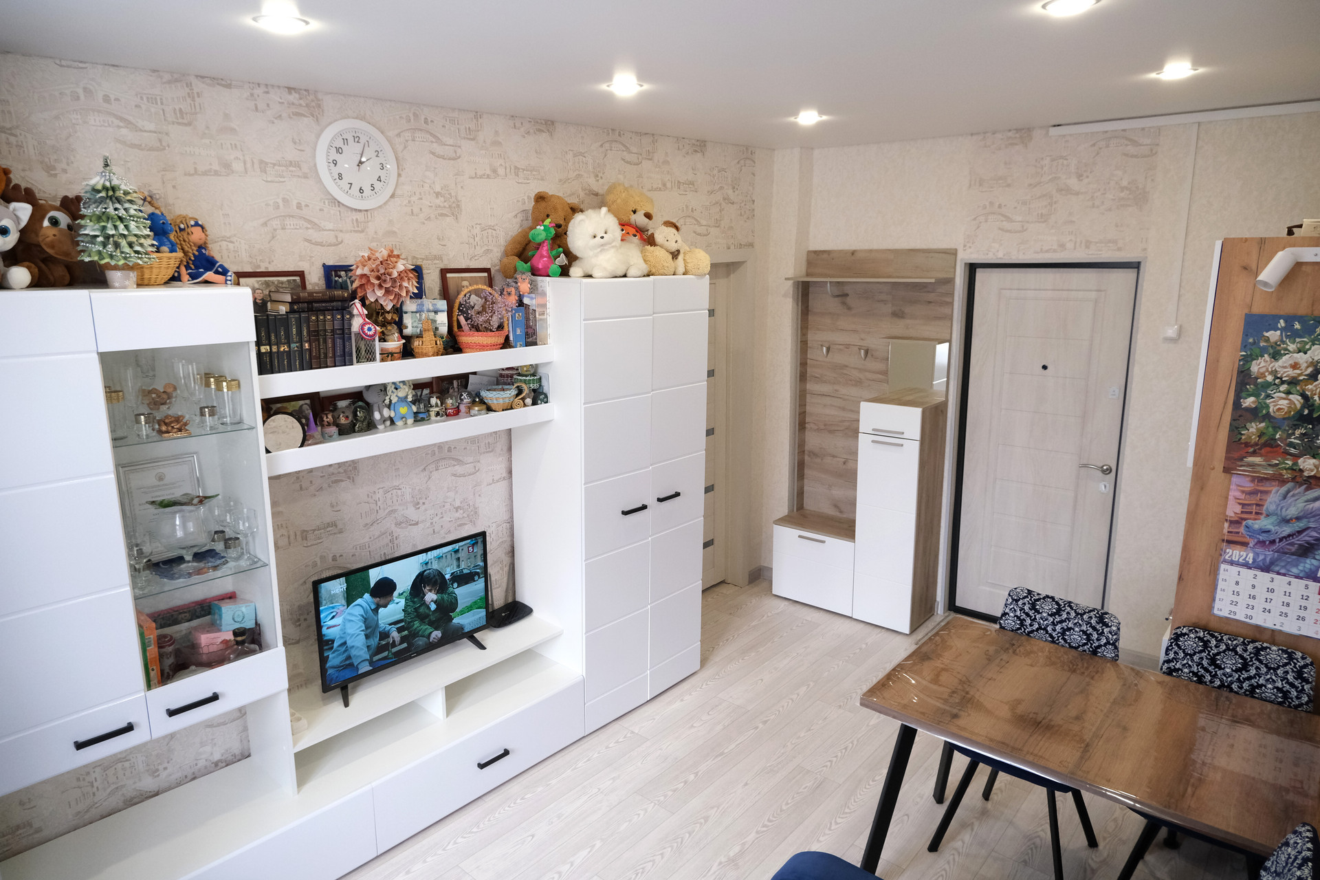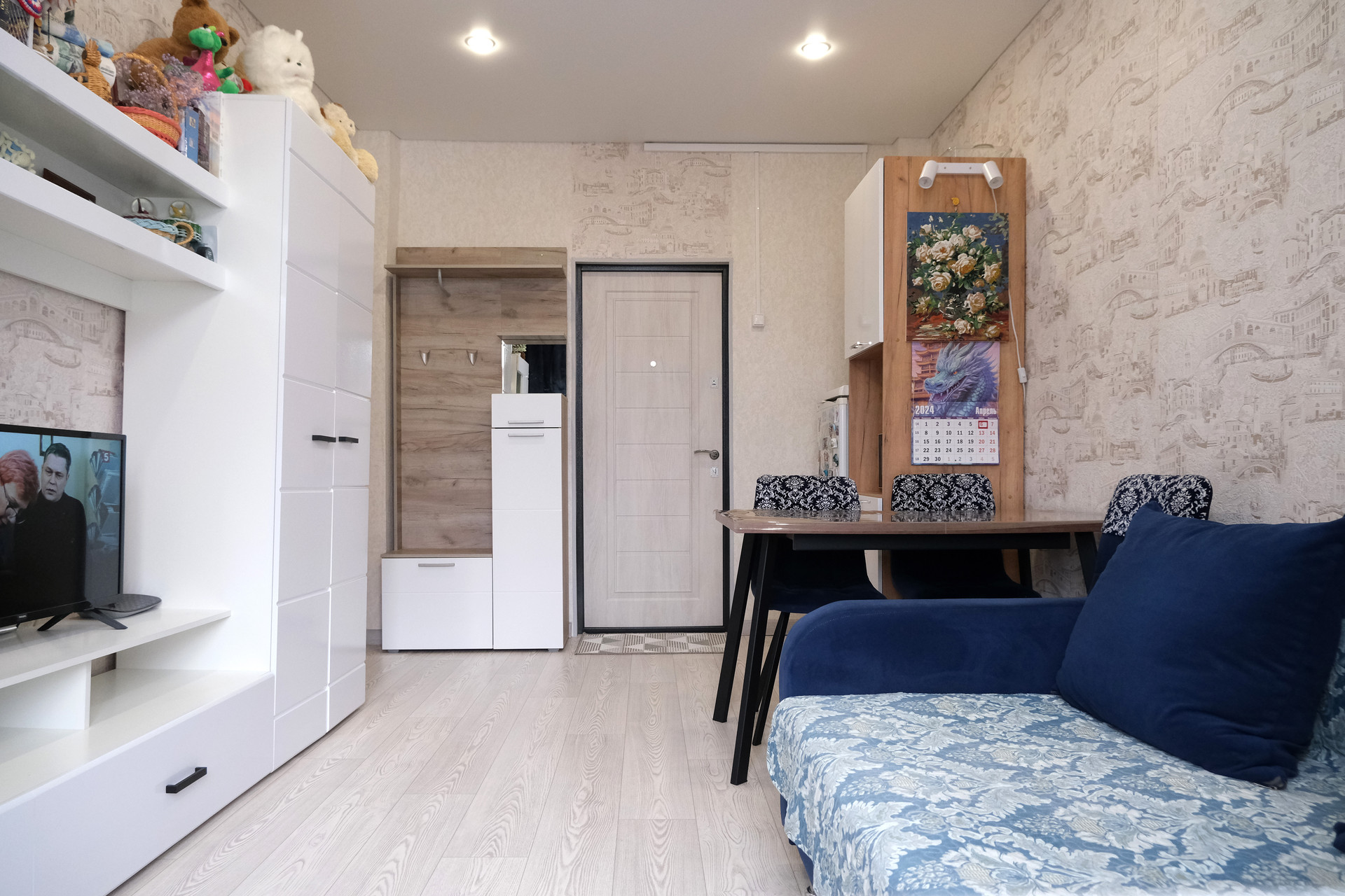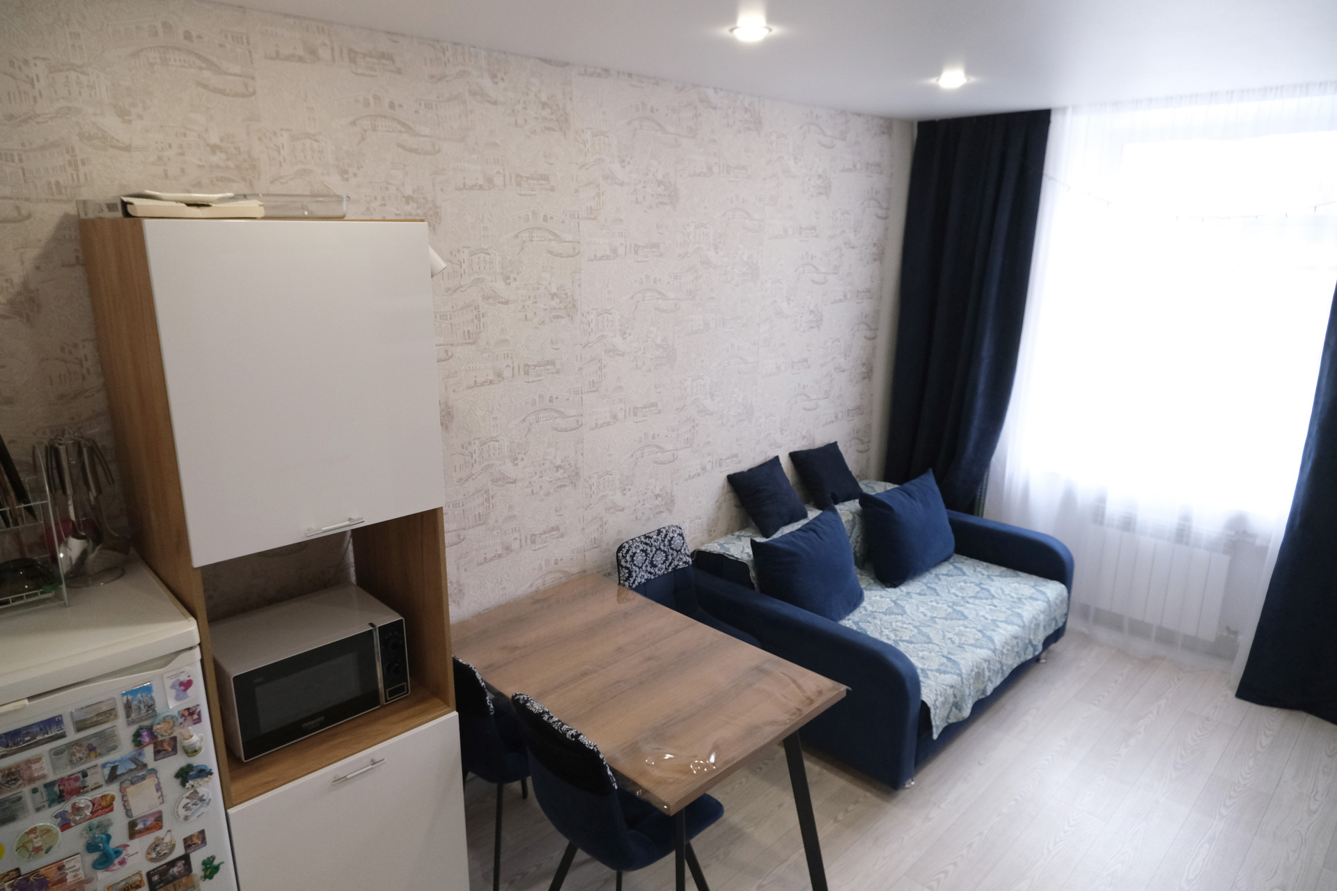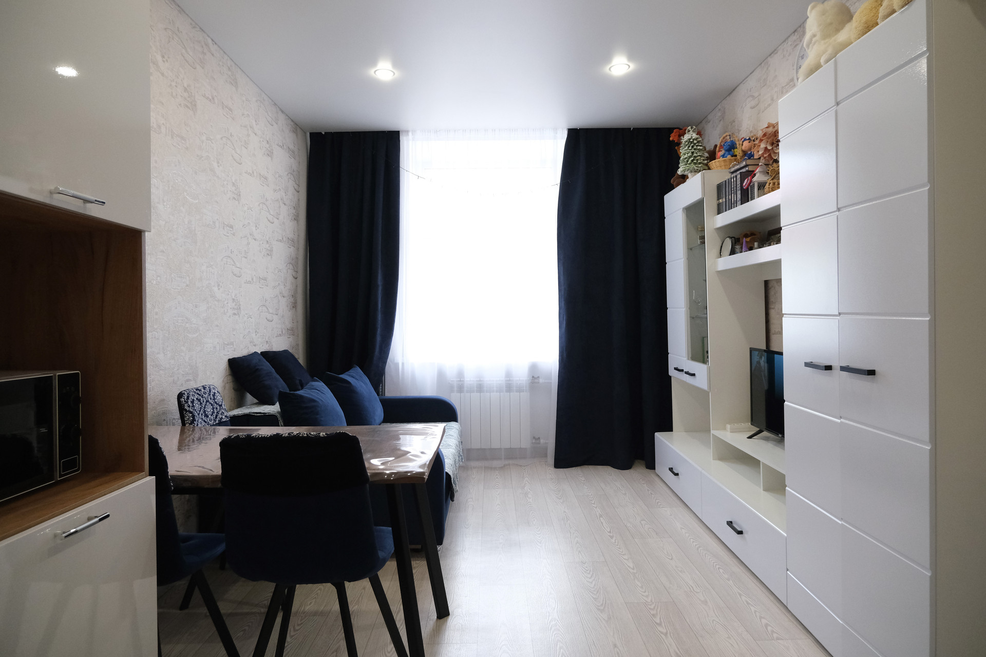 Свежий ремонт, пластиковые окна, натяжные потолки с большим количеством точечных светильников.