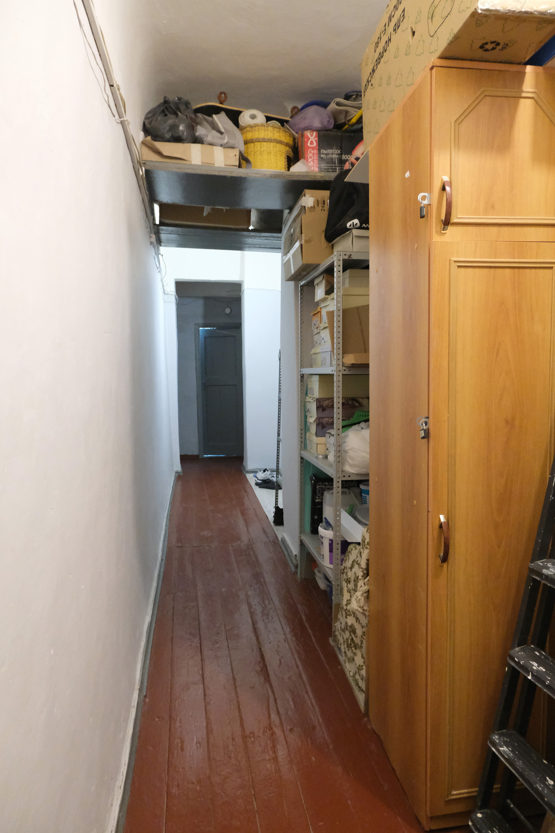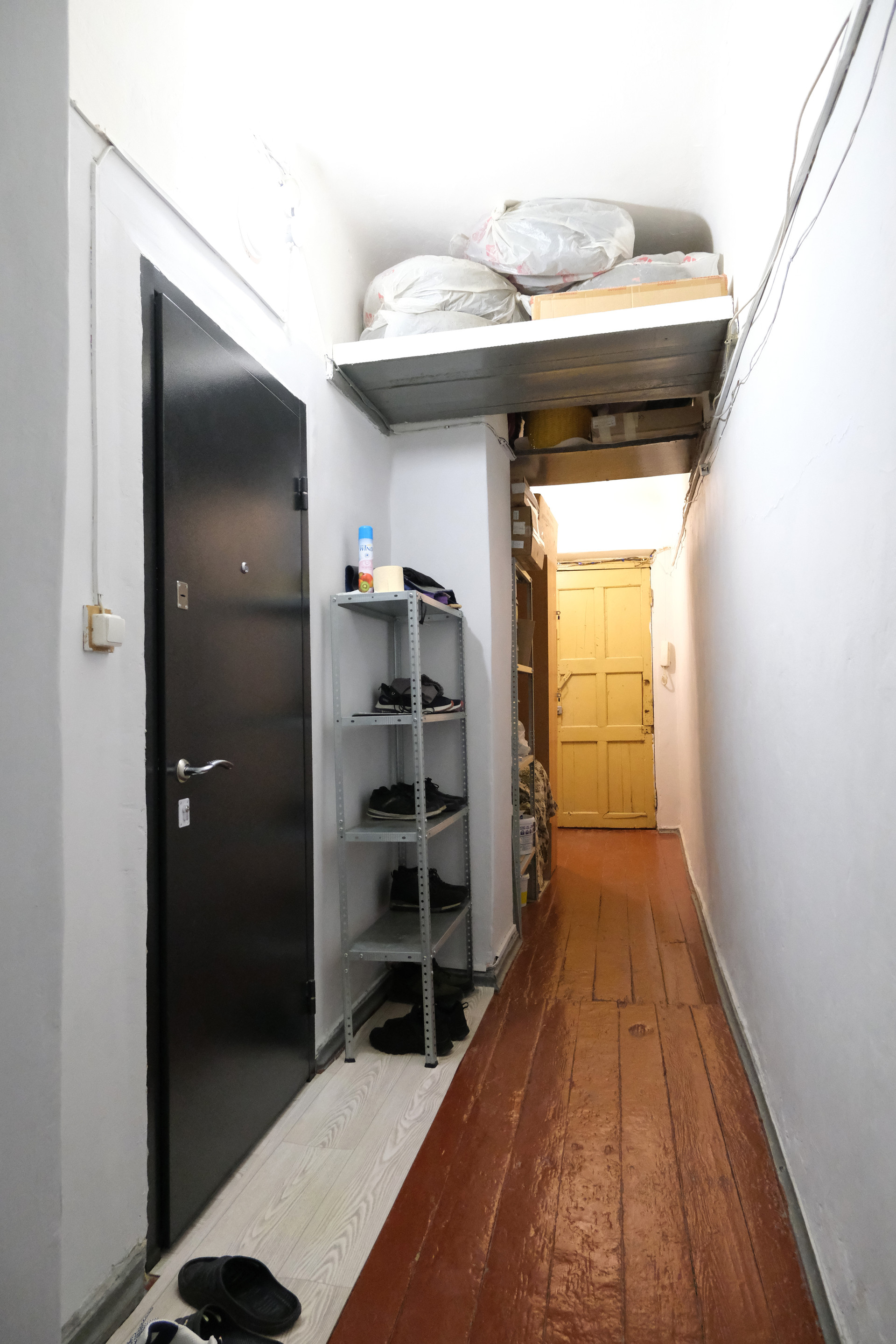 В коридоре есть стеллажи и полки, в том числе для хранения автошин. Принадлежащая площадь части мест общего пользования почти 17,7м². В третьей комнате соседствует тихая спокойная семья.