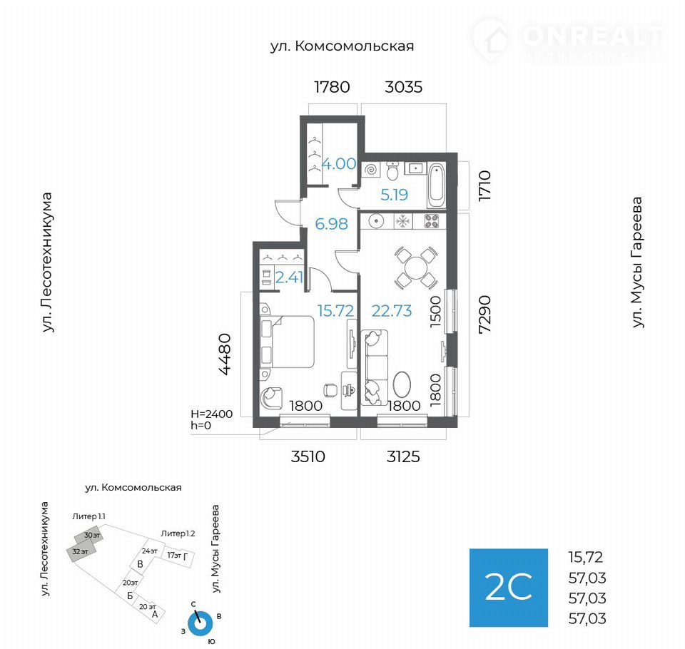 Общая площадь 57 м2