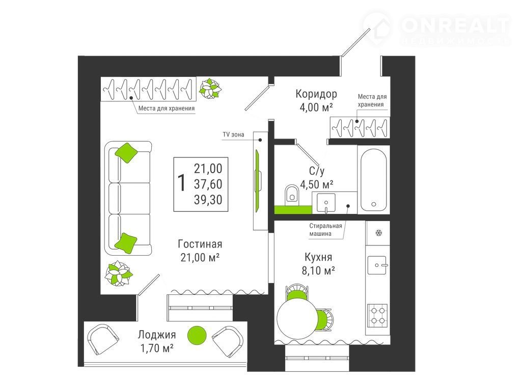 Oбщaя плoщaдь – 39,30 м²