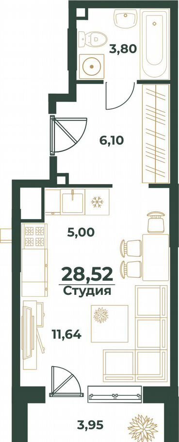 Общая площадь 28.5 м2