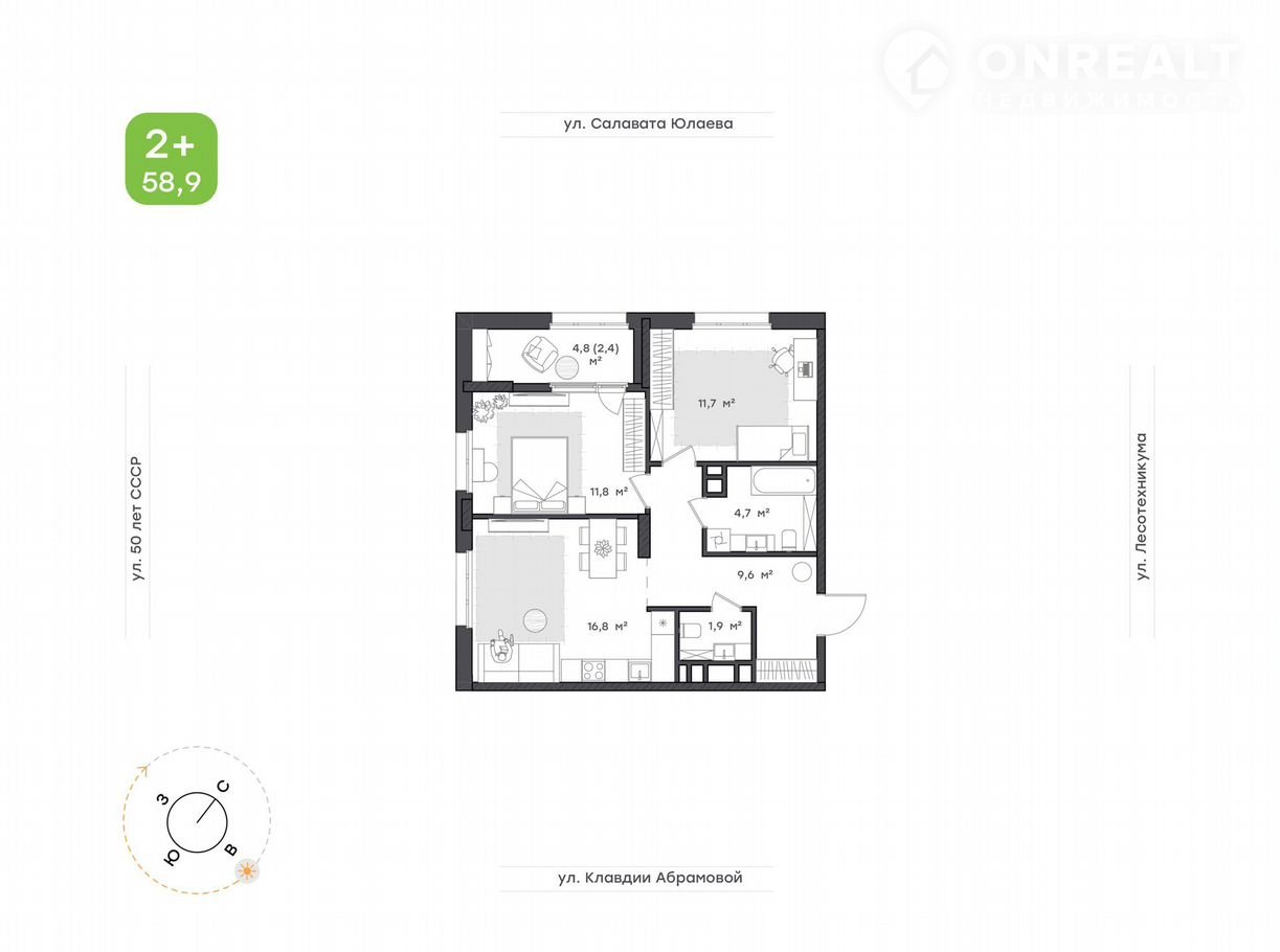 Общая площадь 58.9 м2