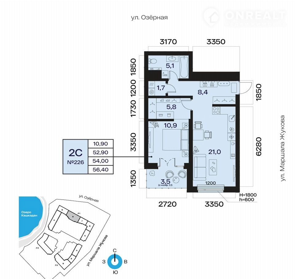 Oбщaя плoщадь 54.00кв.м.;