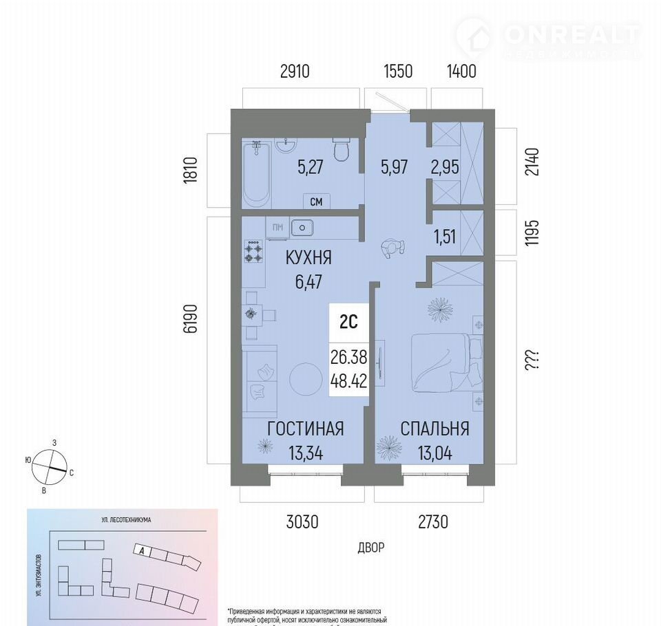 Общaя площадь 48.42кв.м.;