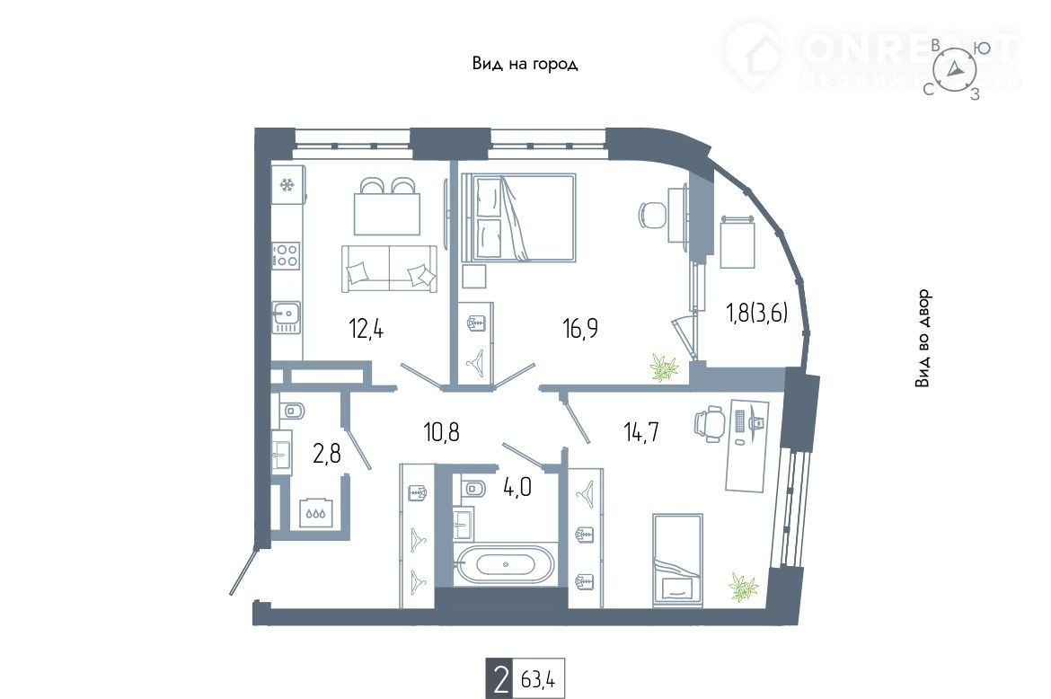 Общая площадь 63 м2