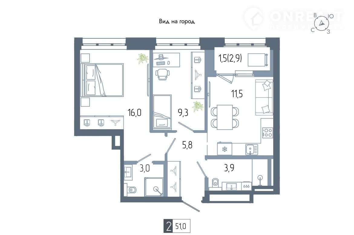 Общая площадь 51 м2