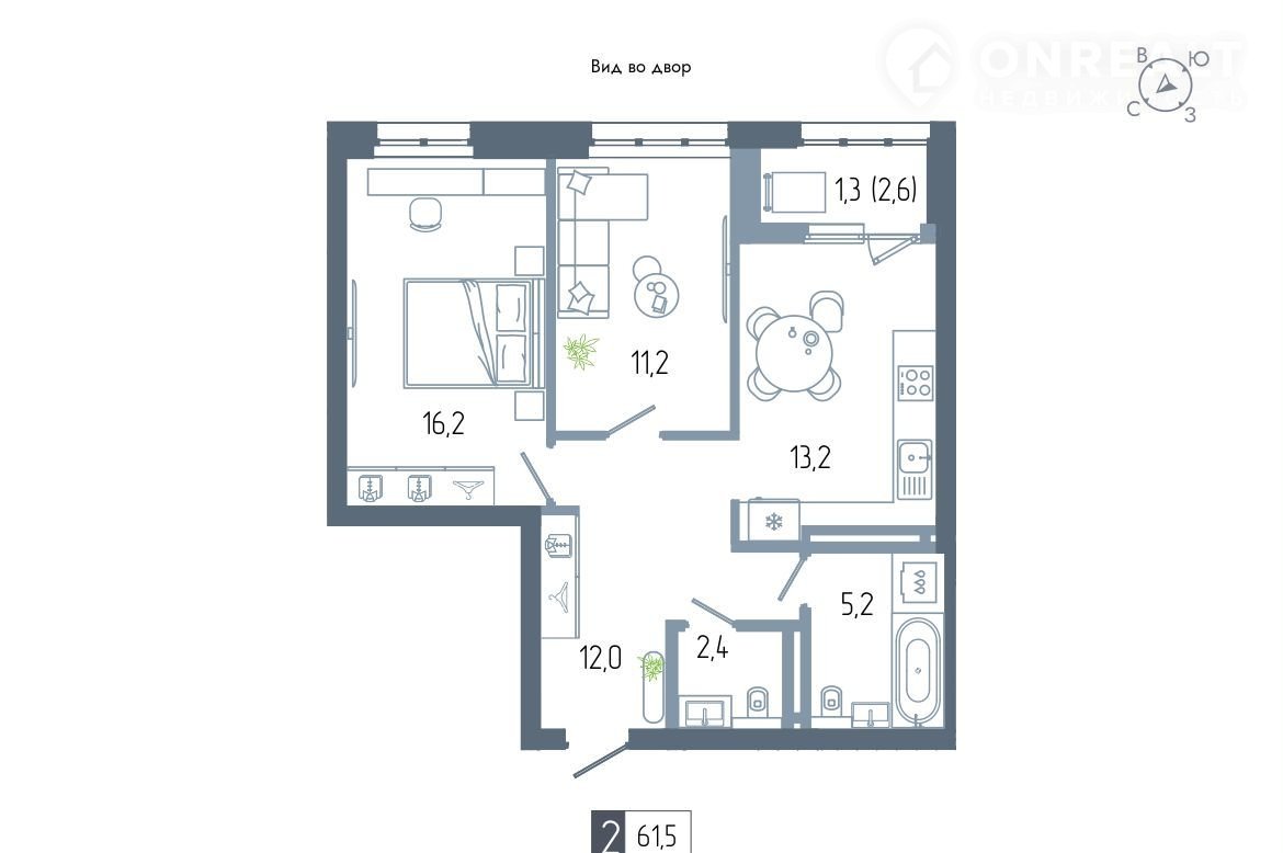 Общая площадь 61.5 м2