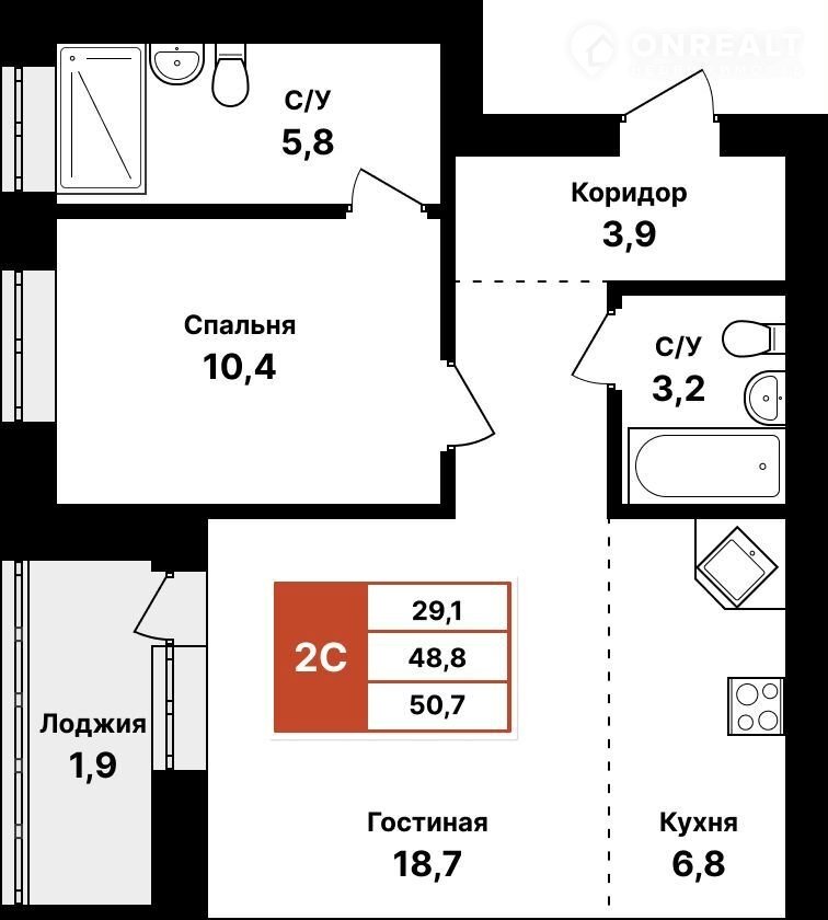 Общая площадь 50.7 м2