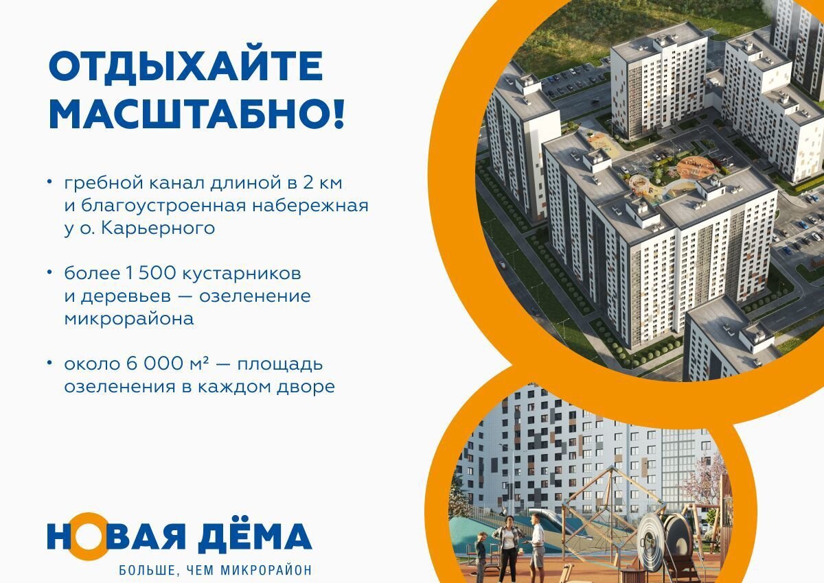 Микрорайон «Новая Дёма» на 9 многоэтажных домов расположен на пересечении улиц Мечтателей и Генерала Кусимова. Комплекс находится в зеленой зоне, в 20 минутах езды от центра города.