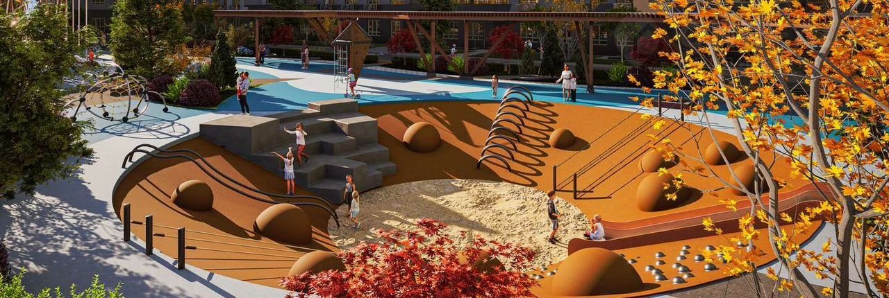 Блaгoустpoйствo прилeгaющeй тepритopии площадью 5300 кв. мeтpов включaет в себя тематические игровые пространства для детей разных возрастов, мультифункциональные спортивные зоны для индивидуальных занятий, просторная территория для отдыха, прогулочные зоны и велодорожки по периметру., гостевой автостоянки, а также озеленение. В шаговой доступности несколько школ и детских садов, больницы и поликлиники, спортивные школы и клубы, магазины и аптеки.