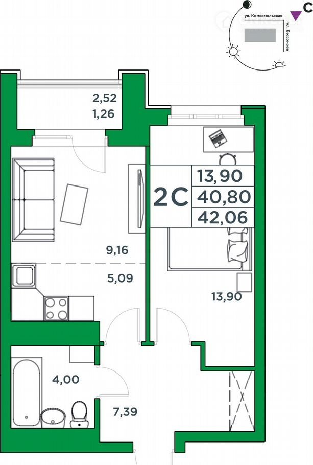 Общая площадь 40.8 м2