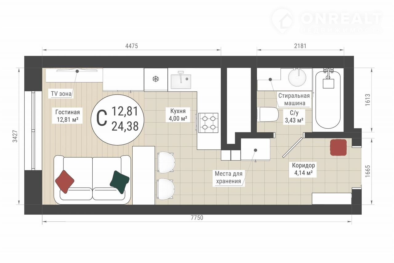 — площадь гостиной – 12,81 м²