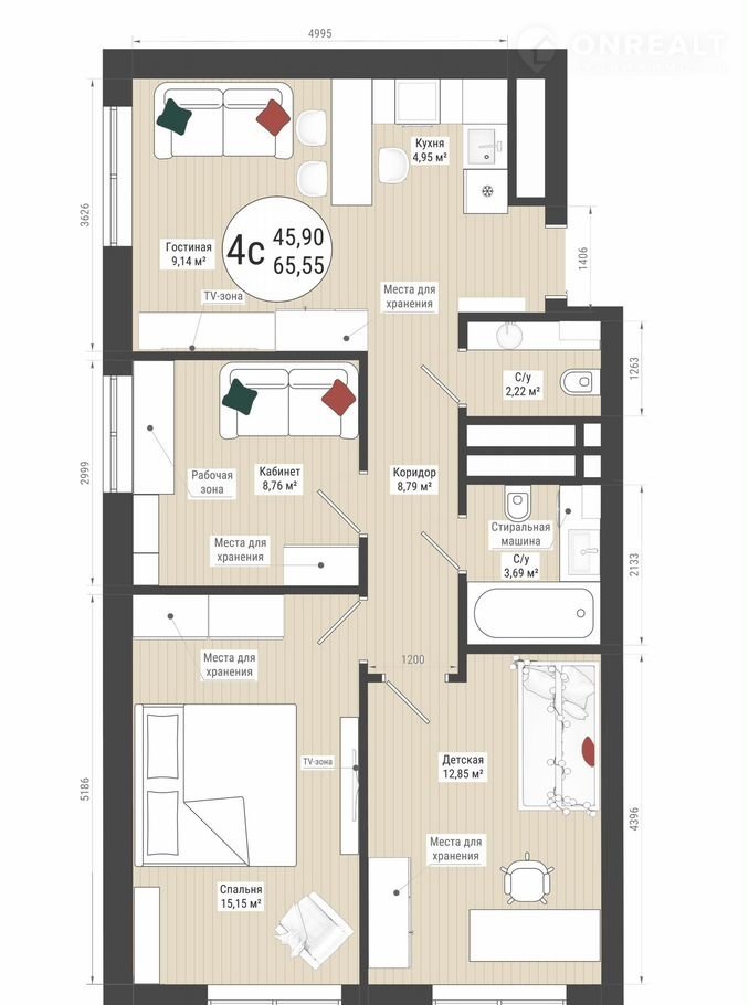 — площадь гостиной – 9,14 м²