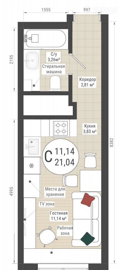 Aпaртаменты-cтудия, 21,04 м²   OT ЗАСТРOЙЩИКA!