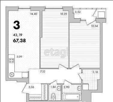 ПАРАМЕТРЫ: пл.общ. 67,38 м2 / жилая 43,19 м2 - две спальни 15,25 и 13,54 м2 / просторная кухня-гостиная 19,49 м2 / раздельный санузел, постирочная комната 3,16 м2, удобная ниша при входе под вместительный шкаф-купе!