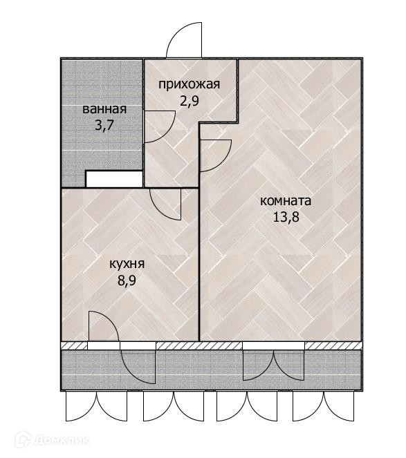 Общая площадь 32,30 кв.м, жилая - 13,80 кв.м, просторная кухня - 8,90 кв.м.