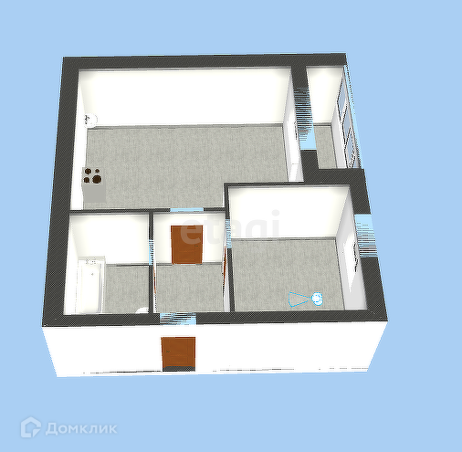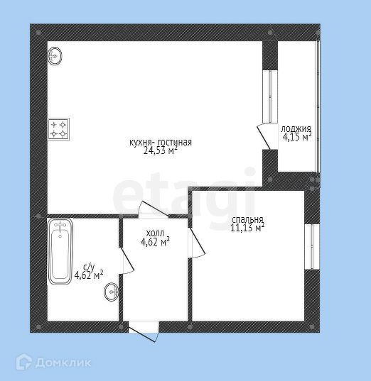 Кварнтира на среднем этаже с функциональной планировкой: квадратный холл с доступом в санузел, кухню-гостиную с лоджией и спальню.