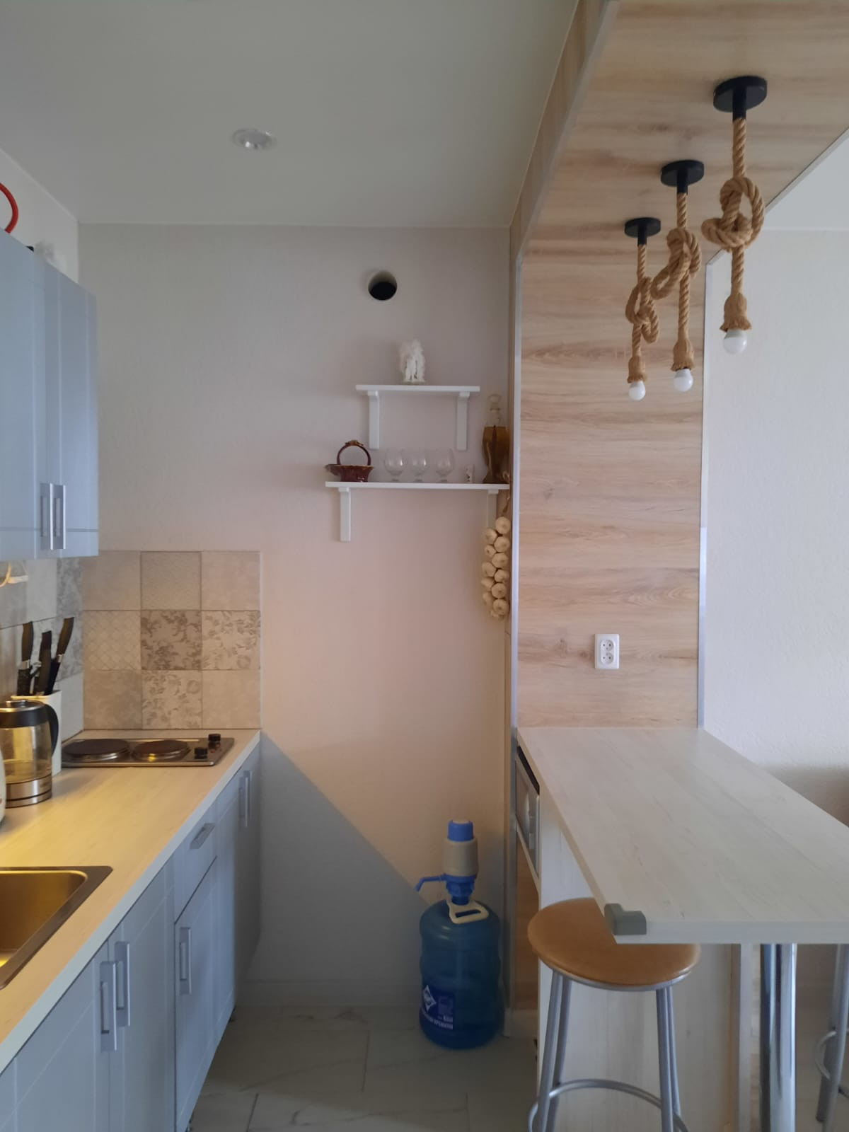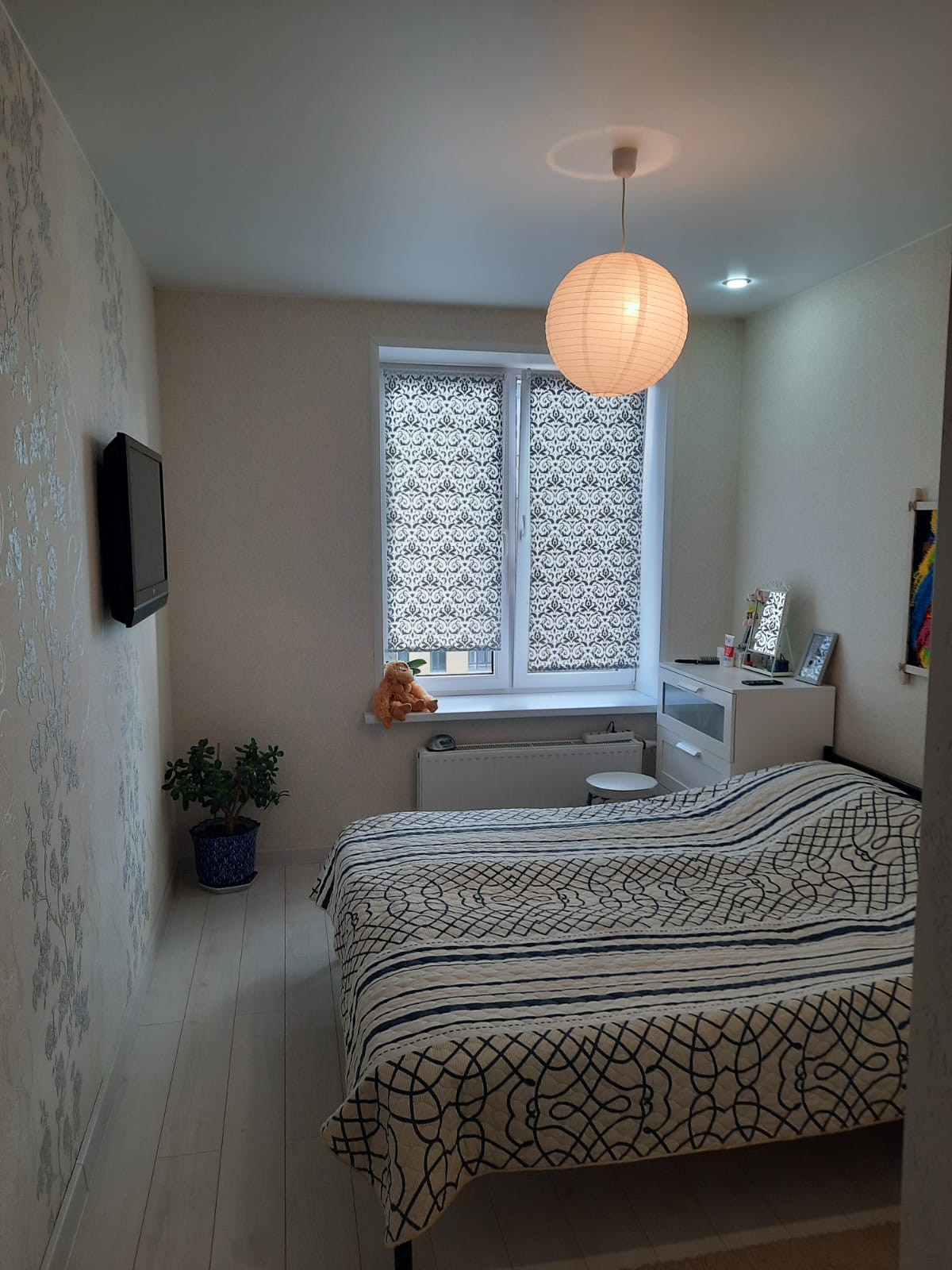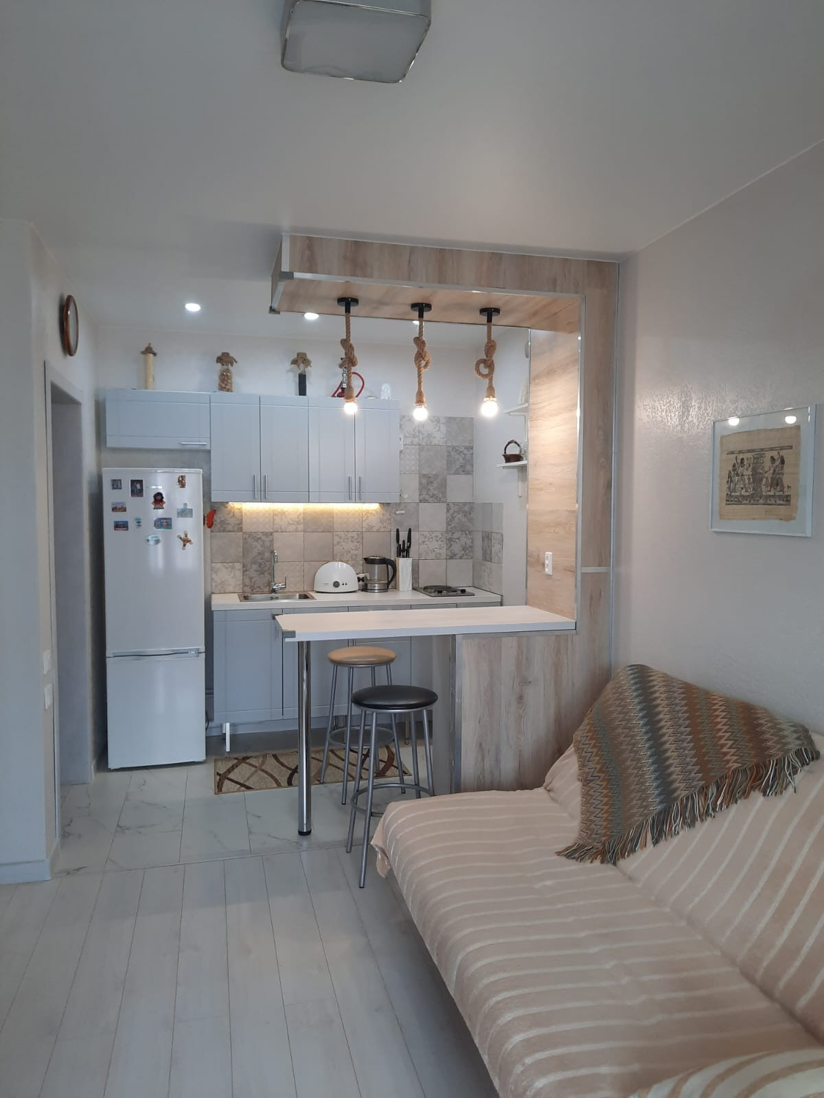 В квартире остаётся: кухонный гарнитур. Встроенный шкаф купе. Барная стойка. Вам остаётся завезти телевизор, диван, холодильник... и можно счастливо жить.