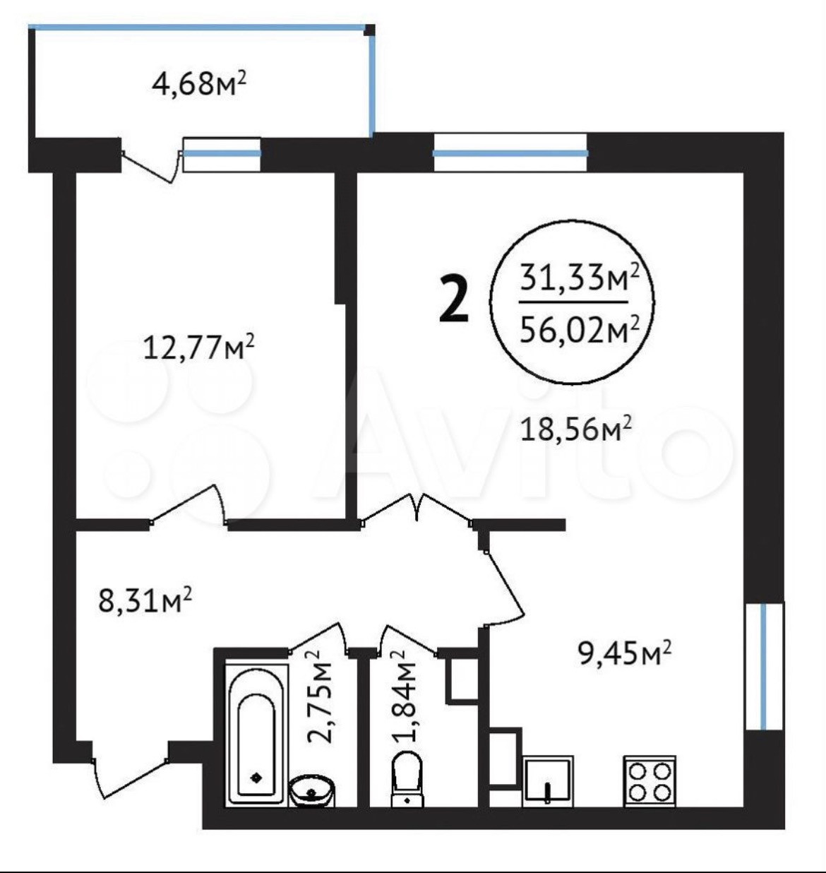 Общая площадь 56.5 м2