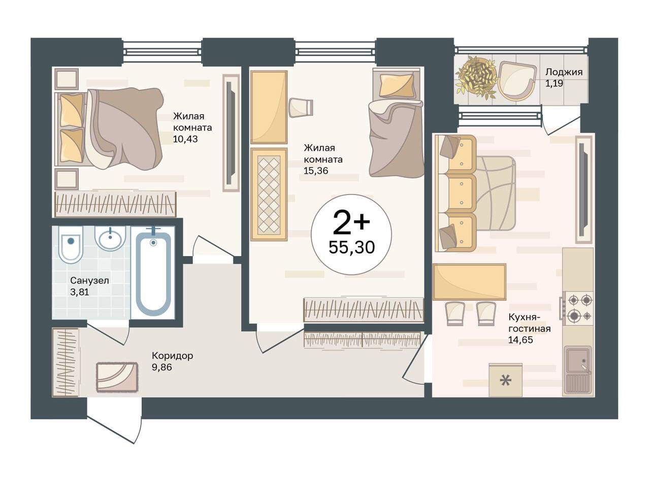 Общая площадь 55.3 м2