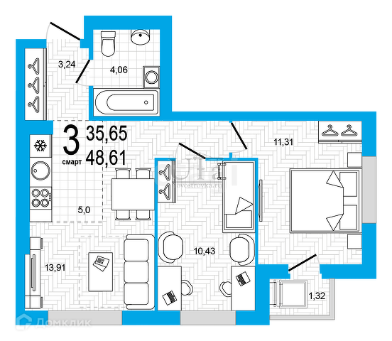 Общая площадь 48.61 м2