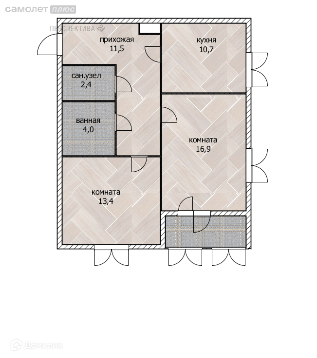 - Две изолированные комнаты: 16,9 кв.м, 13,4кв.м,
