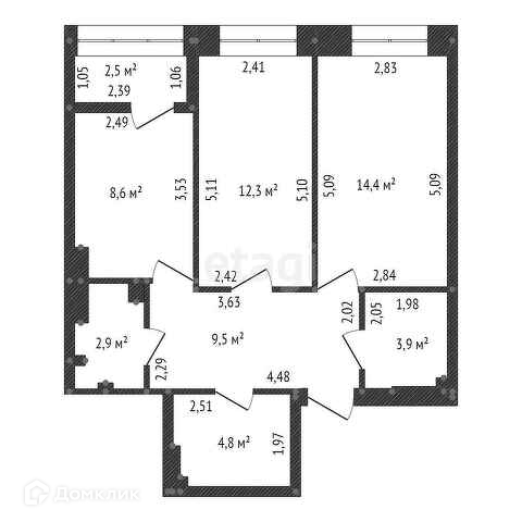 - 2 санузла 3,9 и 2,9 кв.м