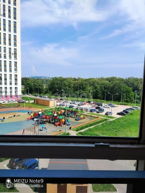 Вид из окна: во двор на детскую площадку, на озеро, лес и на город.